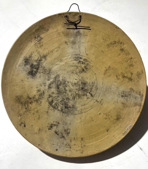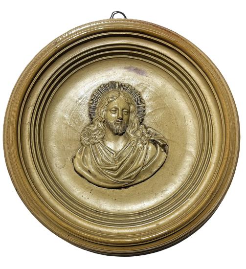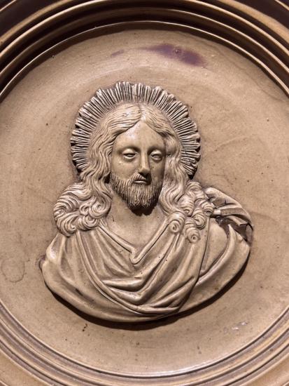 Starožitný závěsný obraz s plastickou podobiznou Ježíše. Průměr keramického obrazu je 23,5 cm. Rozměry Ježíše jsou 10,5 x 9,5 cm. Podobizna Ježíše má prasklinu u levého ramene. Neznačeno.