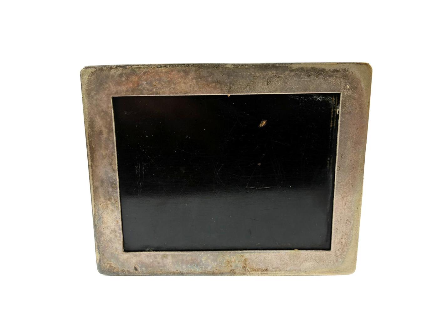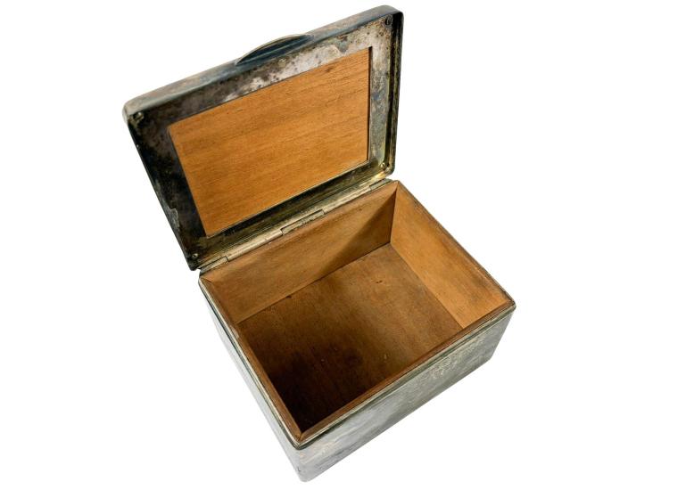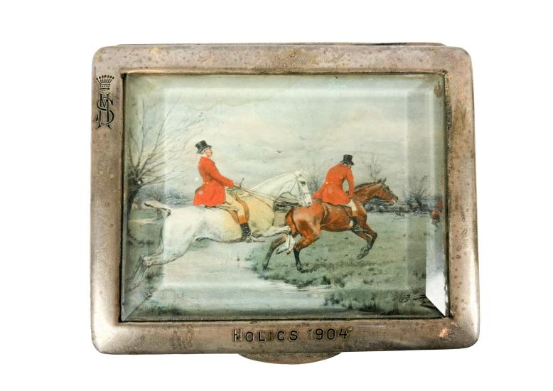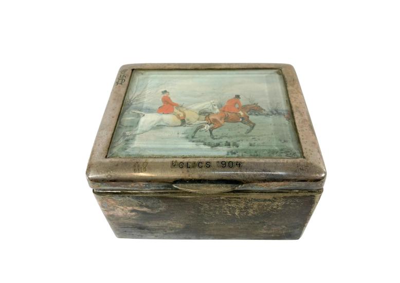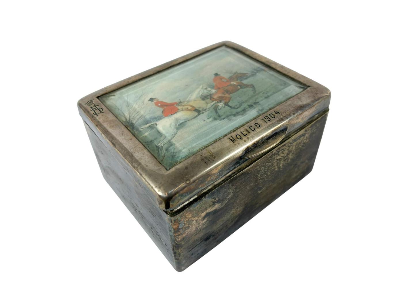 Kovová krabička vykládaná dřevem se skleněným víkem, pod kterým je ruční kresba s loveckým motivem, signováno vpravo dole, neznám. Materiál: obecný kov, dřevo, sklo. Výška 6,5 cm, rozměry 11 x 8,5 cm. Ve spodní části víka je nápis "HOLICS 1904", po boku značení MS - viz foto.