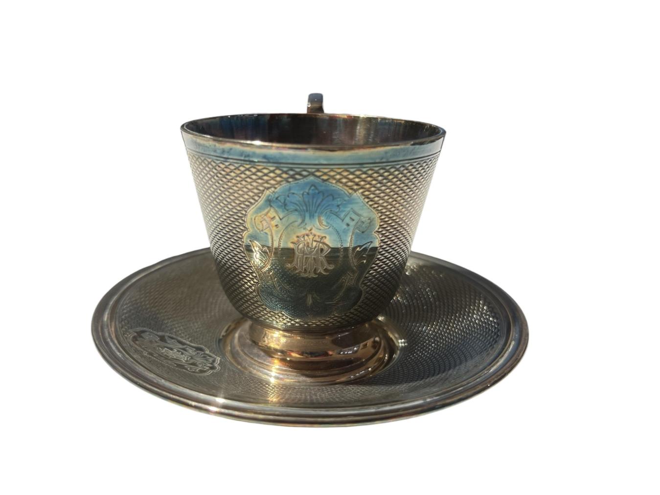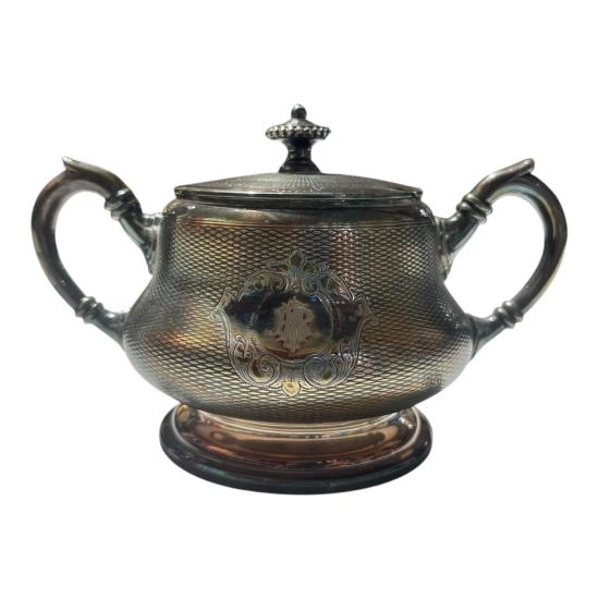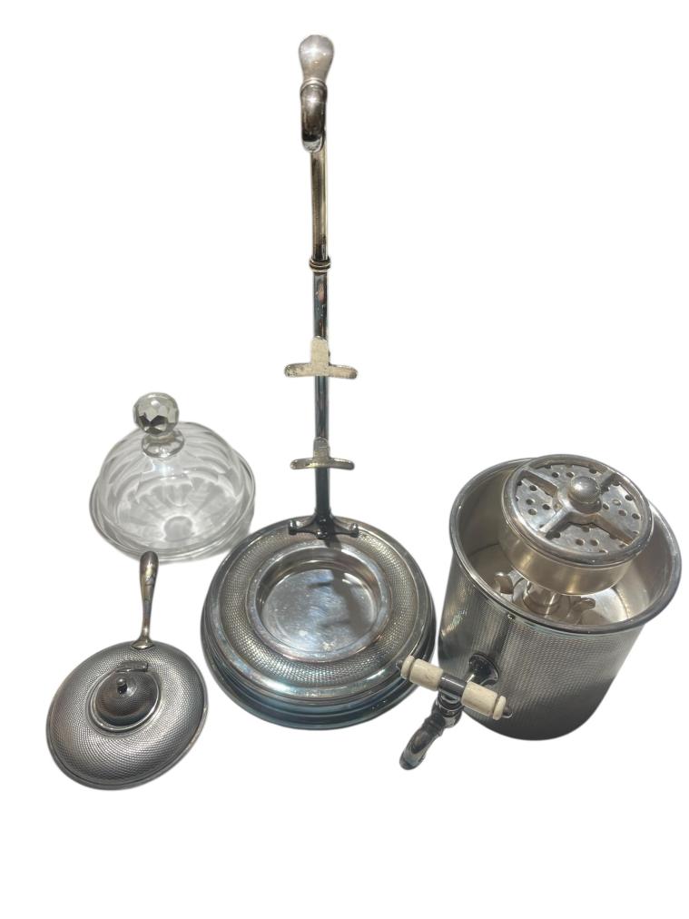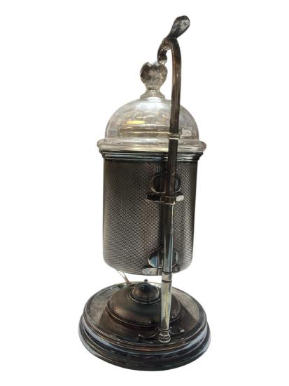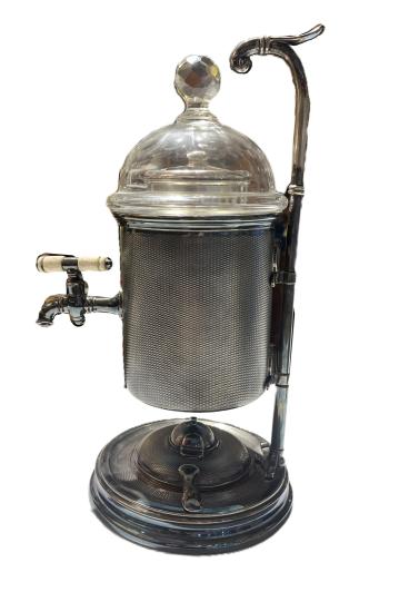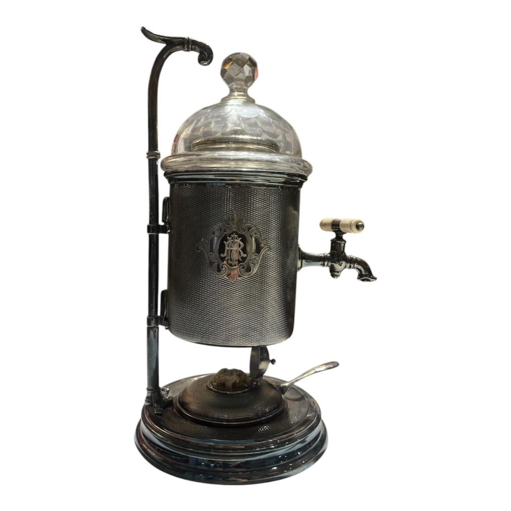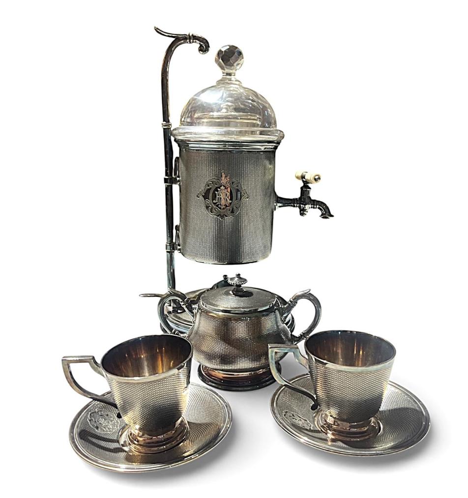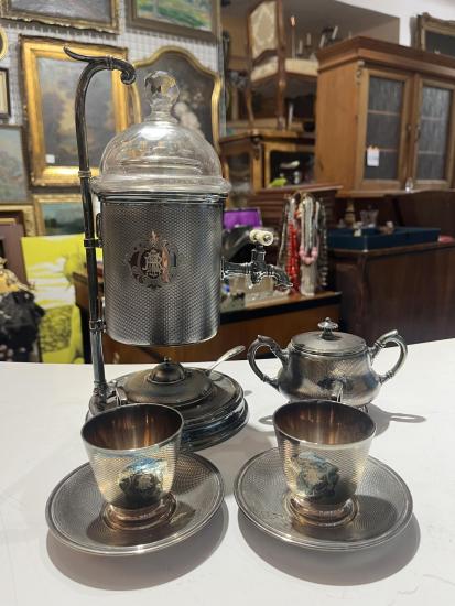 Starožitná přátelská sada na překapávanou kávu. Sada obsahuje konvičkou/ samovar, dva šálky s podšálkem, a cukřenku. Materiál je alpaka a skleněný dobrušovaný poklop. Sada je zdobená mřížkovaným vzorem a monogramem RMI. Velmi dobrý stav, dle nádobky na petrolej a kahanů, nepoužitá. Jediná vada je oxidace materiálu. Nádoba na kávu je odejímatelná ze stojanu. Celková výška samovaru je 32 cm, samostatné nádoby na kávu i s víčkem je výška 22 cm. Průměr podstavy a hrdla je 10 cm. Průměr podšálků je 11 cm, hrdlo šálků má průměr 6 cm. Šířka i s uchem šálků je 9 cm, na výšku měří 6 cm. Cukřenka má v nejvyšším bodě 9 cm, šířku 15 cm, průměr podstavy je 8 cm. Vše značeno ze spodní strany dole ART KRUPP BERNDORF, ALPACCA SILBER. Touto značkou se dříve značily vysoce kvalitní stříbřené alpakové předměty firmy Berndorfer Metallwaarenfabrik Arthur Krupp, Rakousko. Bez poškození.