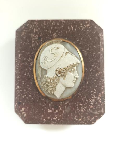 Krásné mramorové těžítko s kamejí. Rozměry: 7,5 x 6,5 x 2,5cm. Kamej je z kamene a je zasazená do kovové obruby. velice jemná sochařská práce.