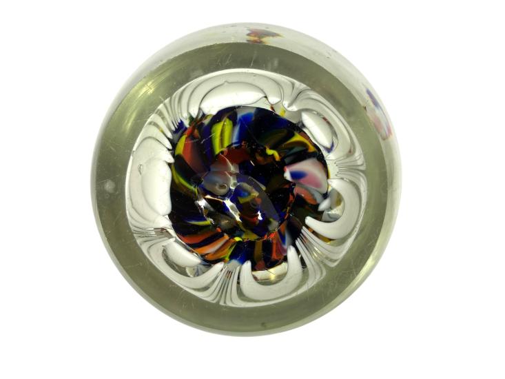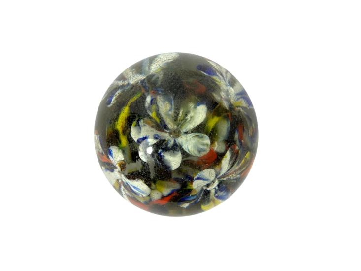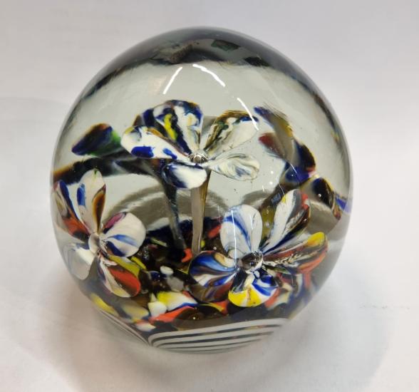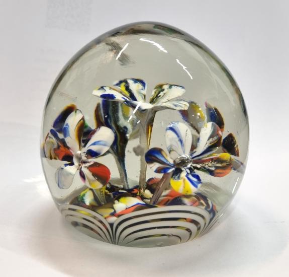 Krásné starožitné těžítko z čirého skla s barevnými květy uvnitř. Ručně vyrobené umělecké dílo z českého skla. Na výšku měří 9 cm, průměr podstavy je 6,5 cm. V nejširším bodě měří 8,5 cm. Podstava těžítka je zabroušená, místy lehce poškrábaná. Na těžítku jsou drobné škrábance, jinak v dobrém stavu. Neznačeno.
