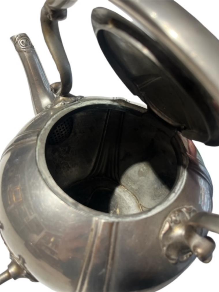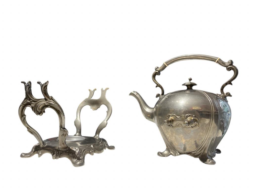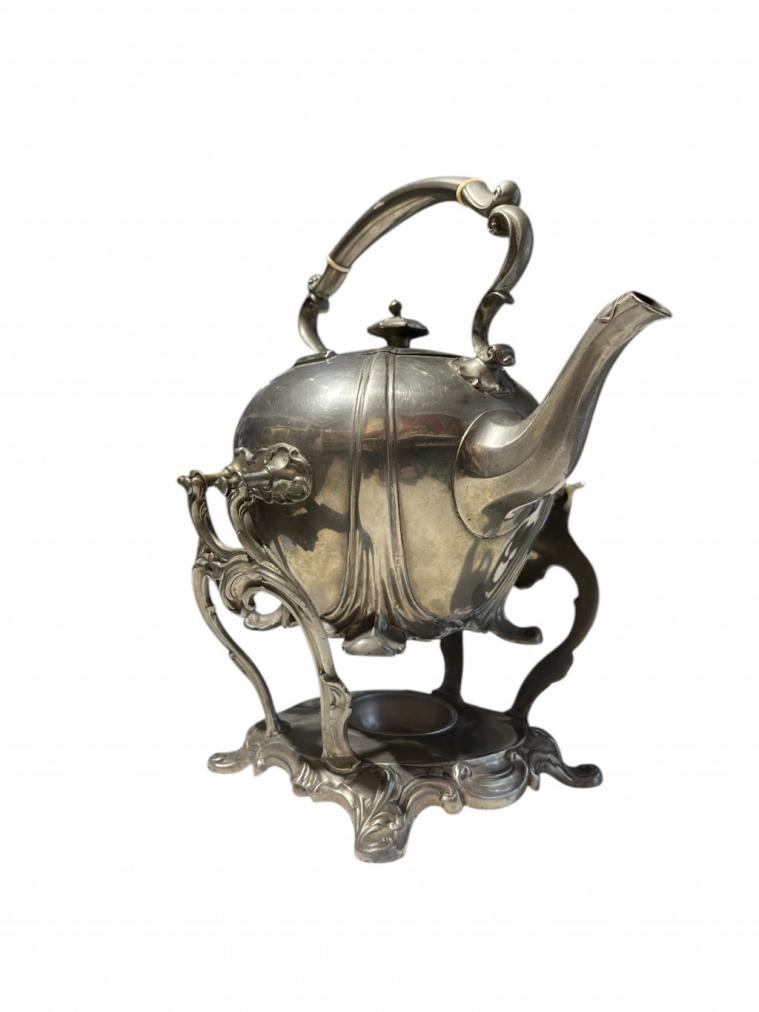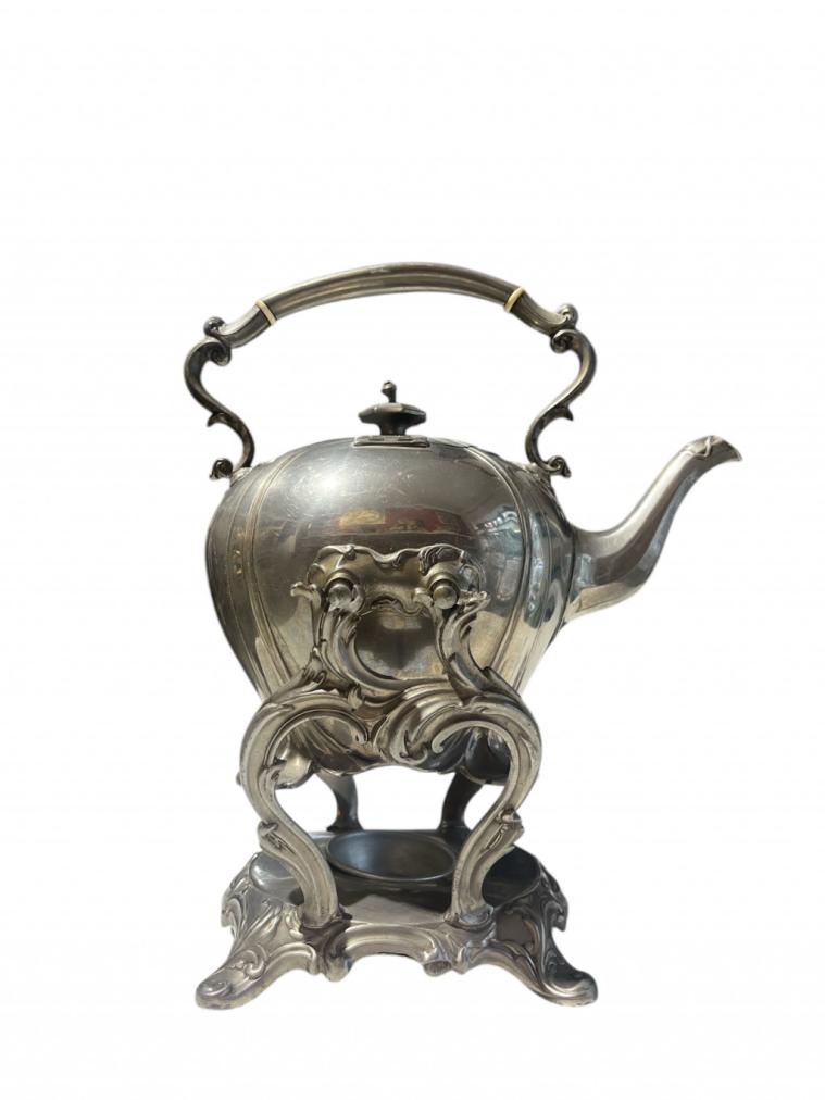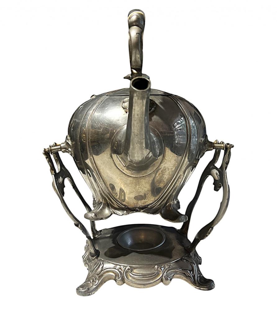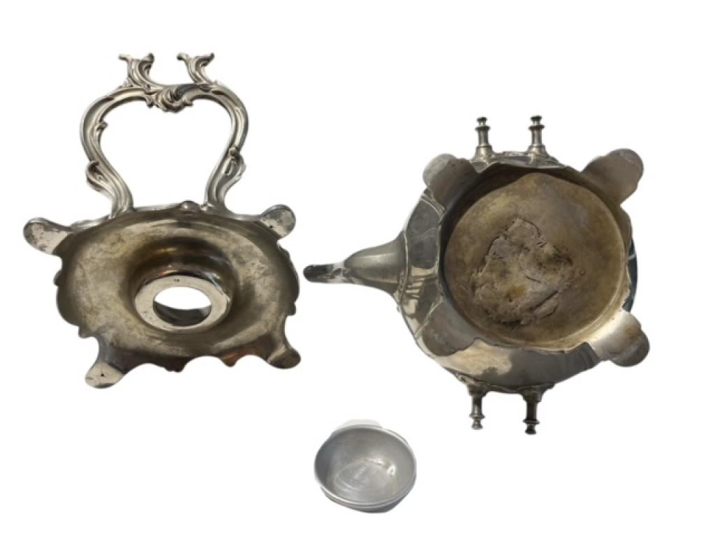 Kovová konvička se stojánkem a prostorem pro svíčku k ohřívání jejího obsahu. Celková výška je 33 cm, v nejširším bodě měří 27 cm, průměr hrdla konvičky je 9 cm. Výška stojánku je 15,5 cm. Neznačeno, bez poškození.