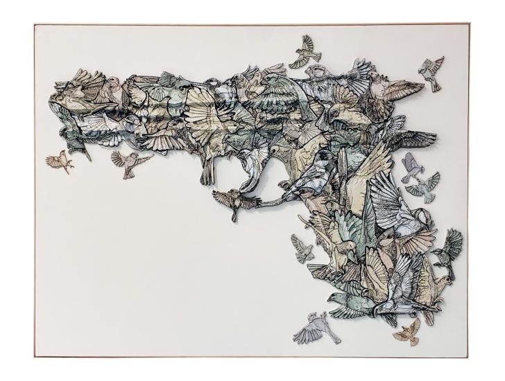 Dílo od české umělkyně Ivany Štenclové a názvem Ptáci. Akryl, překližka. Rozměry 100 x 130 cm. Rok vzniku 2024.