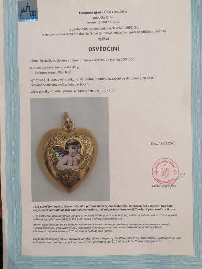 Pozlacený stříbrný přívěs o ryzosti 800/1000, osvědčení z PÚ. Váha 2,42 g, výška včetně očka 27 mm, v nejširším bodě 18 mm. Smalt je po okrajích lehce poškozen.