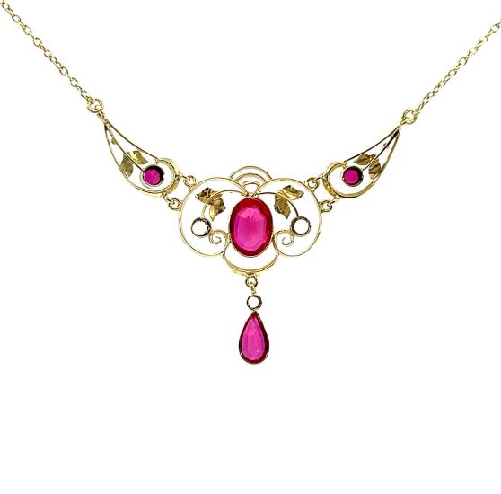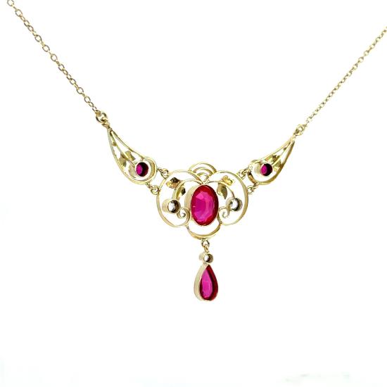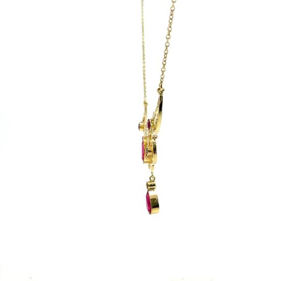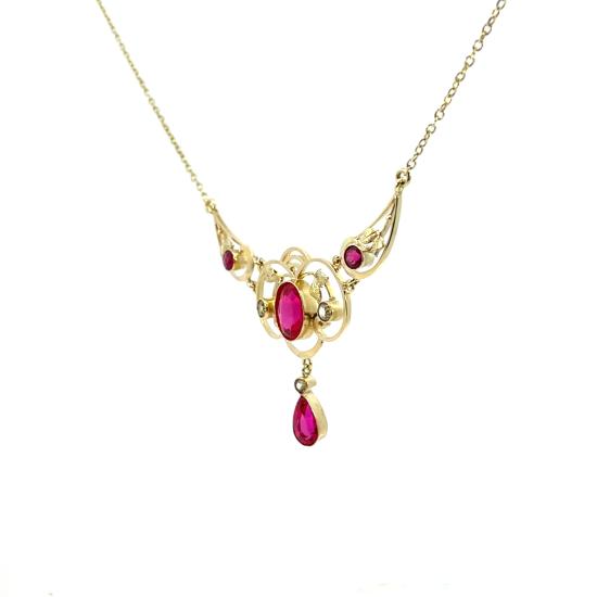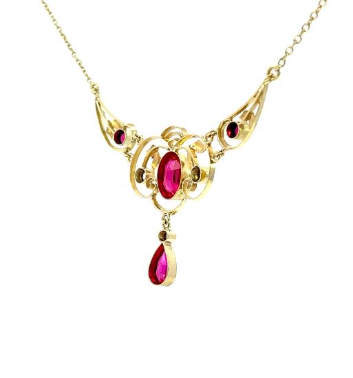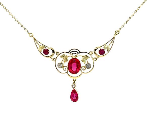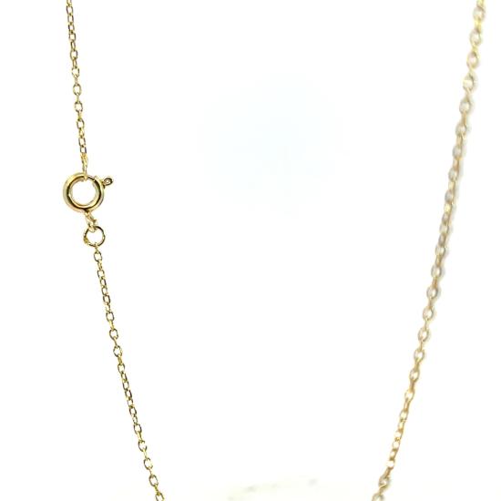 Zlatý kolier o ryzosti 585/1000, punc čejka. Váha 4,93 g, délka 51 cm, šířka řetízku 1 mm, výška přívěsu 40 mm, v nejširším bodě 48 mm. Kameny jsou syntetické.