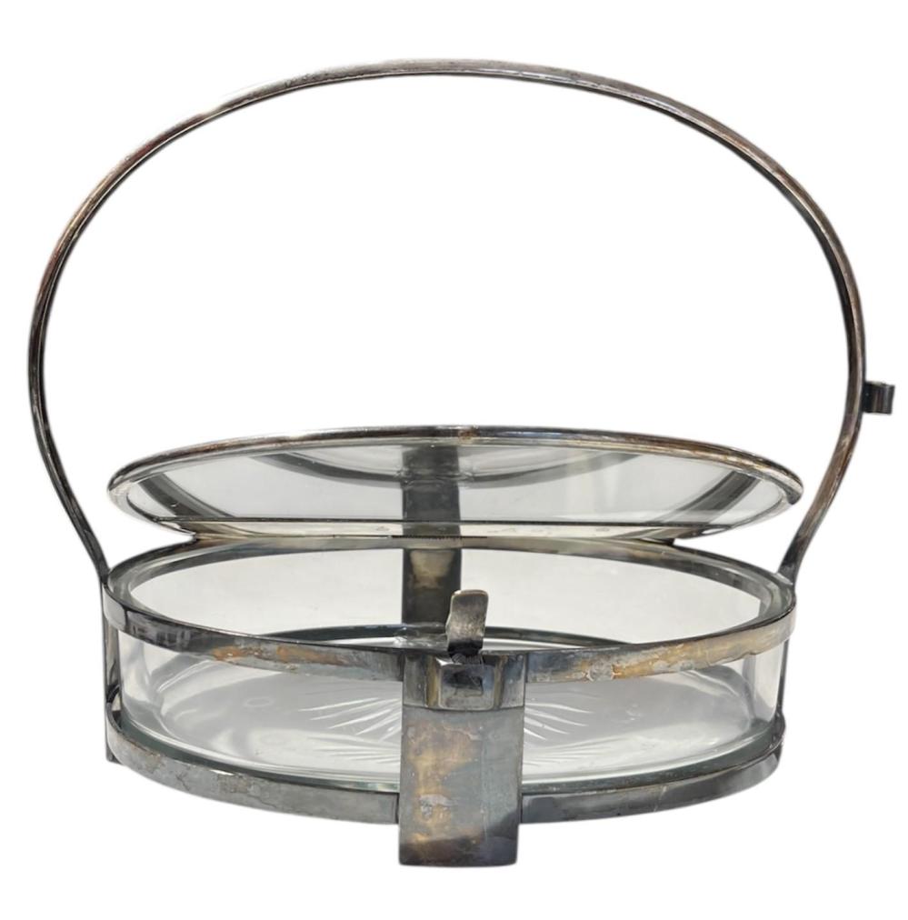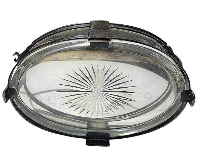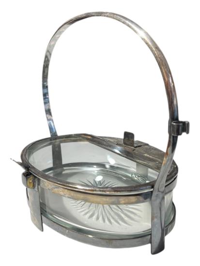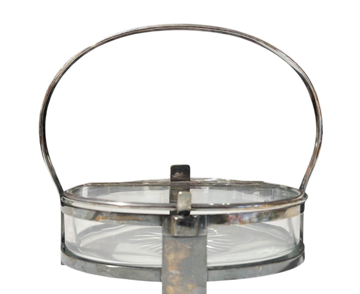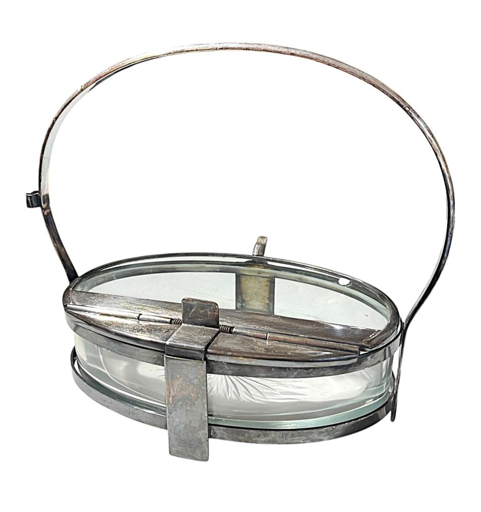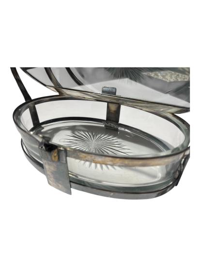 Krásná Art-Deco servírovací mísa s výbrusem, opatřená kovovým mechanismem pro uzavírání a kovovým podstavcem a rukojetí. Otevírání s pružinkou je funkční, skleněná i kovová chromovaná část je v perfektním stavu pouze s lehkými mapami v chromování a na pružinkách se nachází rez. Víko úplně něpřiléhá. Jinak v dobrém stavu bez poškození. Opatřeno držákem na lžíci. Celková výška i s madlem je 25 cm. Samotná dóza měří na výšku i s nožkama 7,5 cm. Šířka v nejširším bodě- madlo- 28cm, šířka dozy je 24 cm, hloubka 17 cm. Neznačeno.