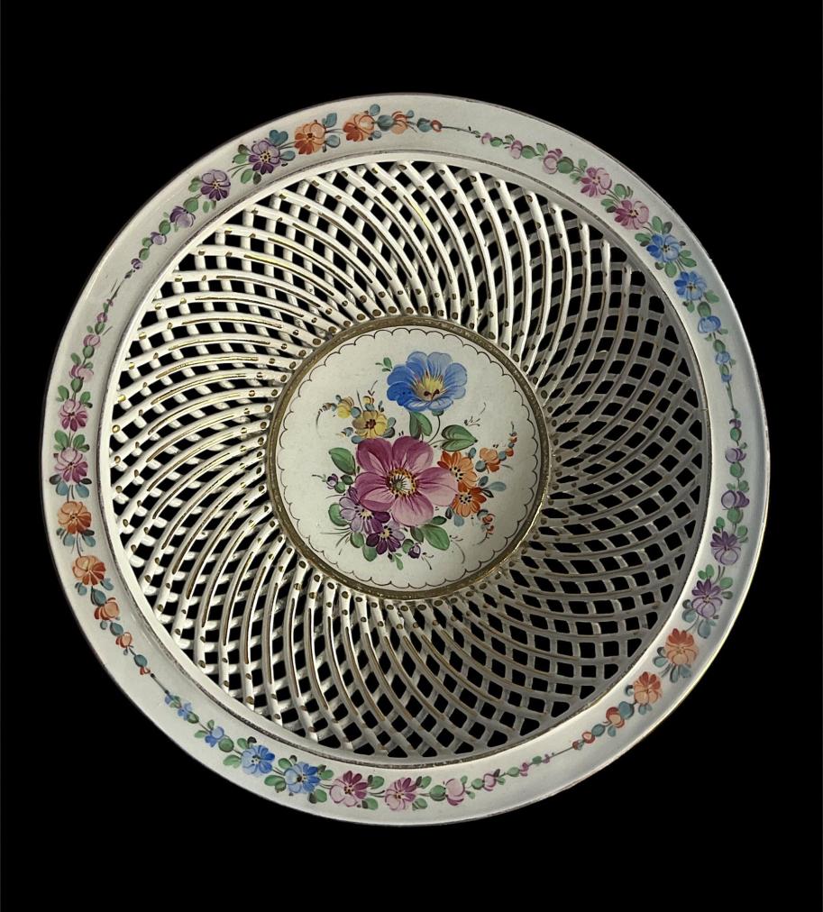 Krásný porcelánový talířek se zajímavým "pleteným" vzorem a zlacením. Vyrobila porcelánka Max Roesler, Dresden. Starožitný prolamovaný talíř zdobí ručně malovaná barevná kvítka. Průměr 16 cm, průměr podstavy 5,5 cm, výška 4,5 cm. Místy lehce ošoupané zlacení, jinak v perfektním stavu bez poškození. Značeno ze spodní strany dole: RMR erb, Dresden.