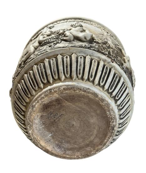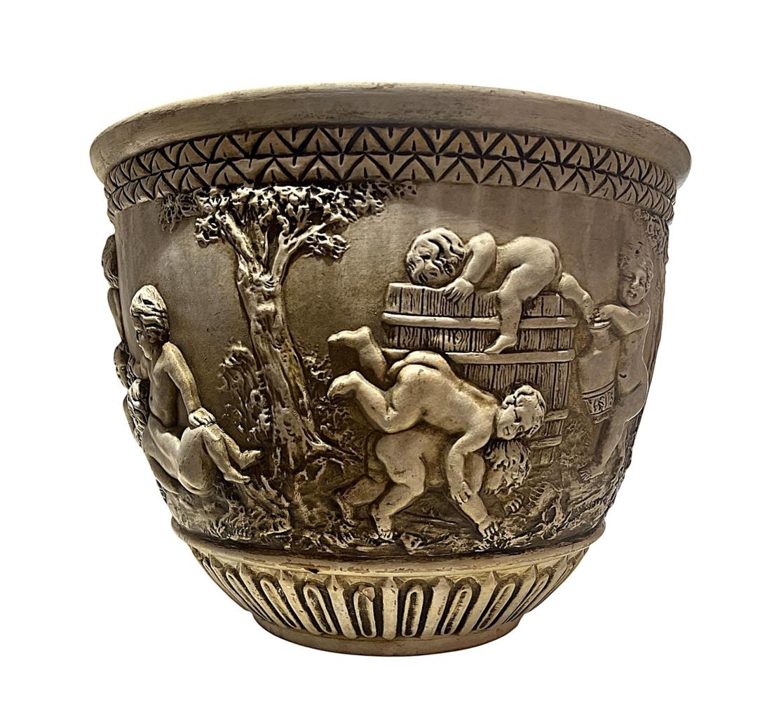 Velký starožitný obal na květináč z kameniny, s plastickým motivem několika Putti, kteří tráví čas v zahradě. Autorem je Johann Maresch. Na výšku měří 30 cm, průměr hrdla je 39 cm. Průměr podstavy je 19 cm. Nádoba má místy oloupanou povrchovou barvu a pár drobných oťuků, žádné větší poškození nemá. Interiér vybarvený černou barvou. Značeno ze spodní strany dole monogramem JM- Johan Mareš, číslem 2707 a nápisem Czechoslowakia.