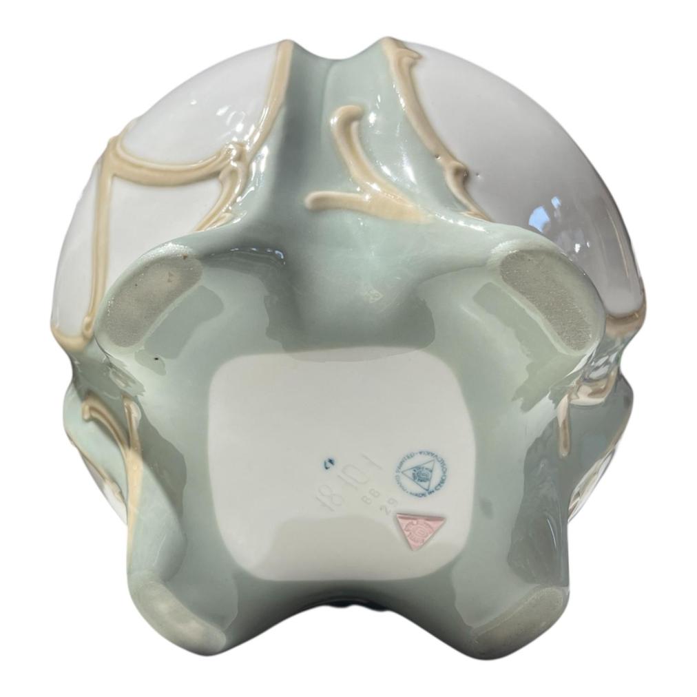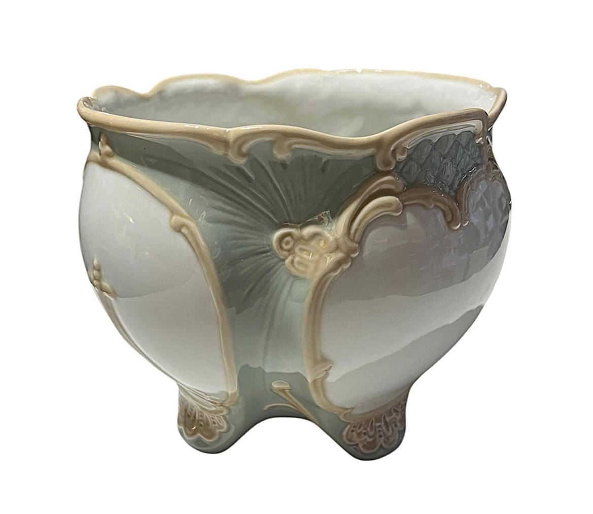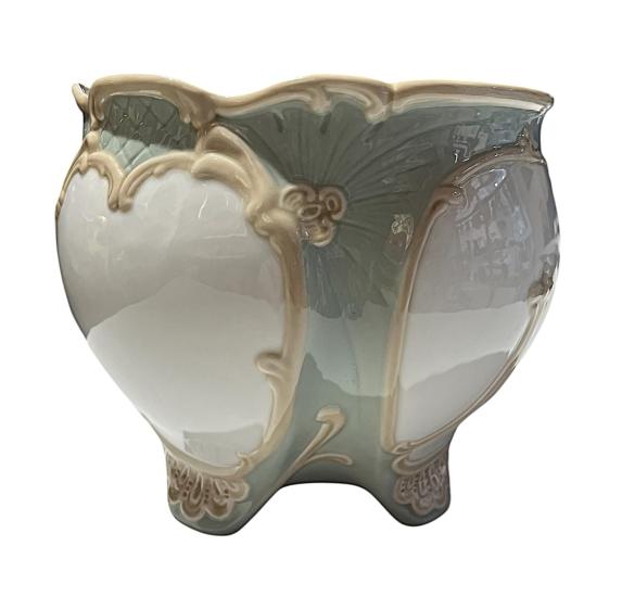 Porcelánový obal na květináč v jemných pastelových barvách se secesním reliéfním dekorem. Vyrobila porcelánka Royal Dux. Na výšku měří 18 cm, průměr otvoru je 20 cm. Průměr podstavy je 15 cm. V nejširším bodě měří 24 cm. V perfektním stavu, bez poškození. Značeno ze spodní strany dole- Royal Dux, hand painted.