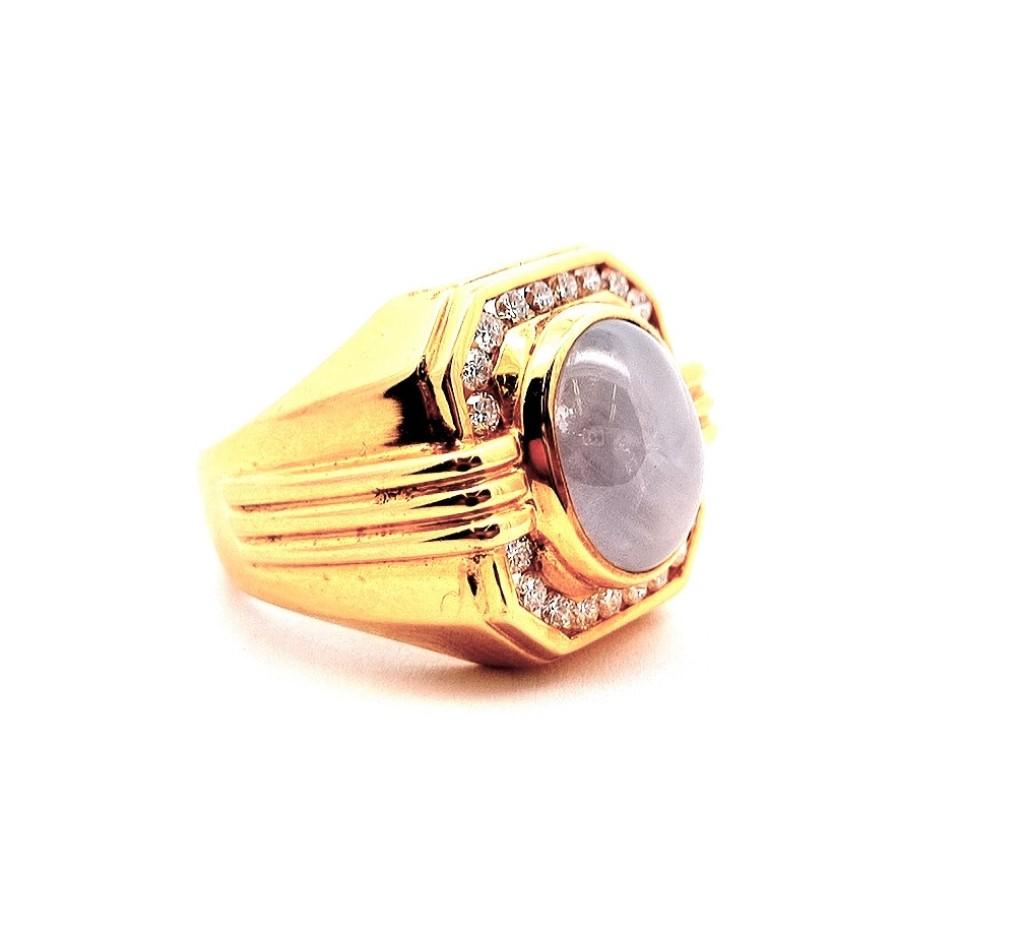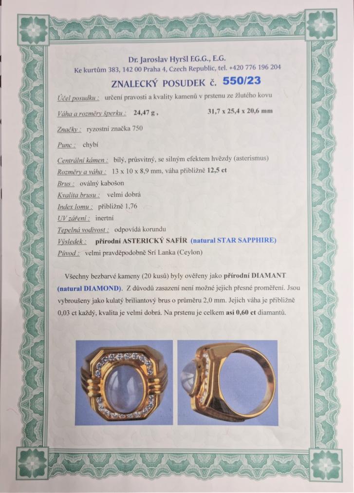 Zlatý prsten o ryzosti 750/1000, punc kohout, váha 24,47 g, velikost 63, v nejširším bodě 21 mm. Kámen - asterický safír (Srí Lanka) - 12,5 ct + diamant briliantového brusu - cca 0,60 ct. Posudek ke kamenům přložen.
