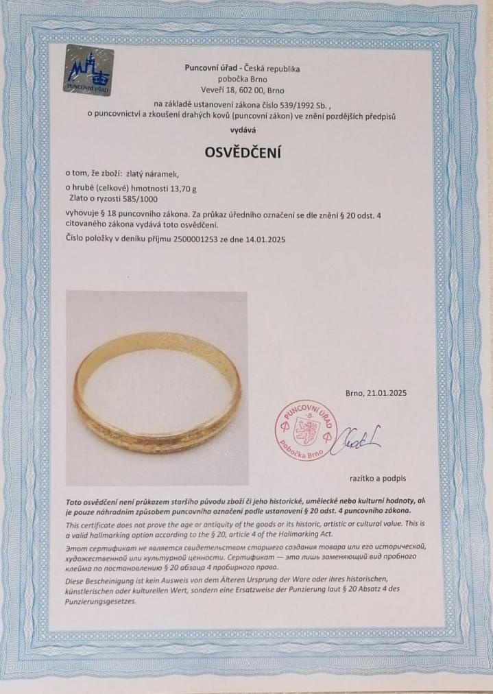 Zdobený kruhový náramek o ryzosti 585/1000 se starým rakouským puncem a osvědčením z PÚ. Váží 13,71 g, průměr 7 cm, v nejširším bodě 11 mm.