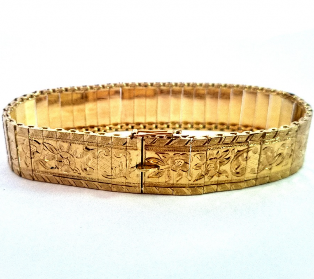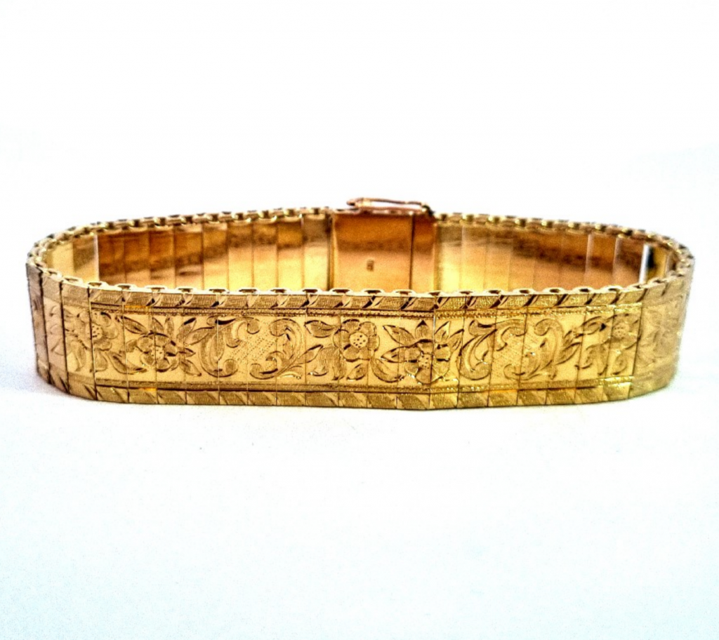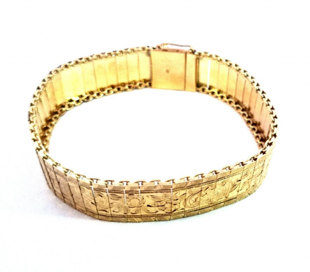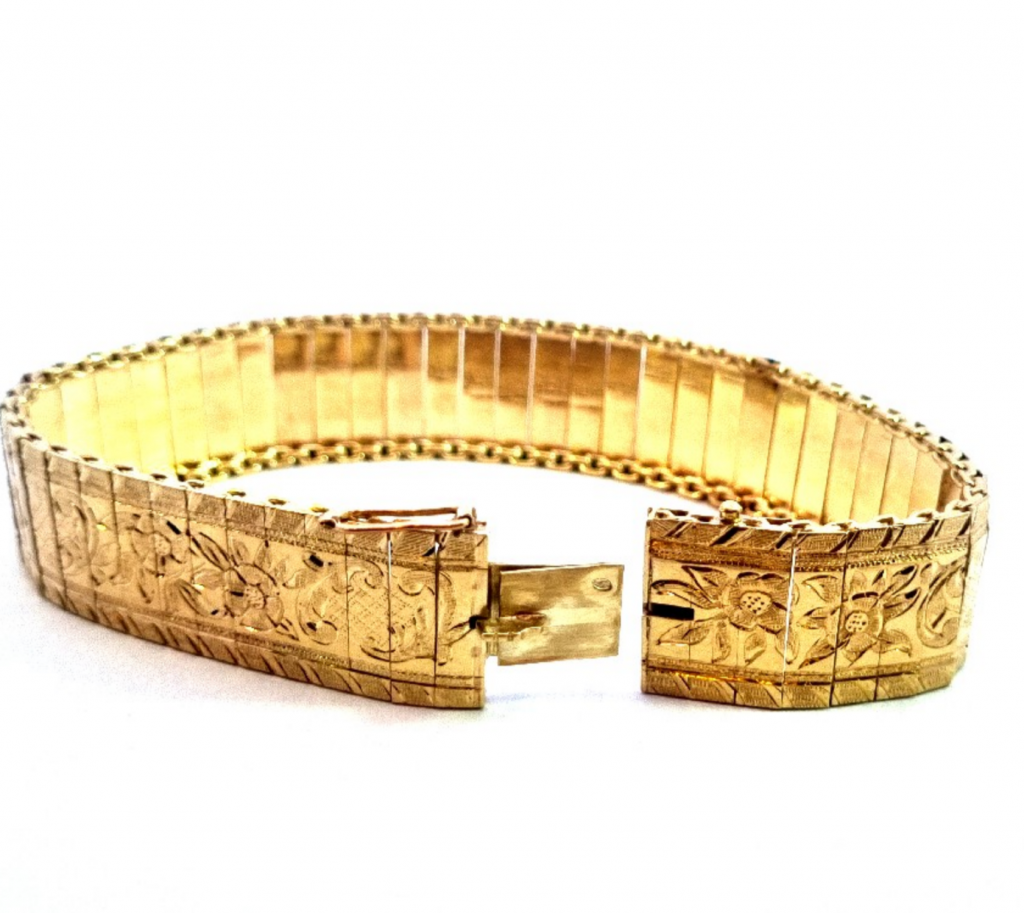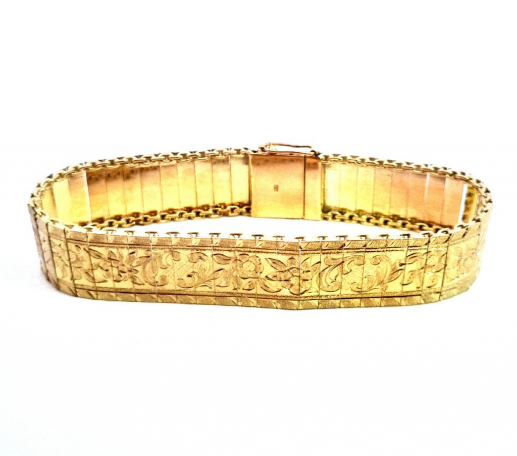 Krásný náramek složený z plátů žlutého zlata o ryzosti 585/1000 s puncem čejky. Zdobí jej rytina s florálními motivy. Váží 20,23 g, jeho celková délka je 18,3 cm. Na šířku měří 14 mm a zapínání je opatřeno pojistkou.
