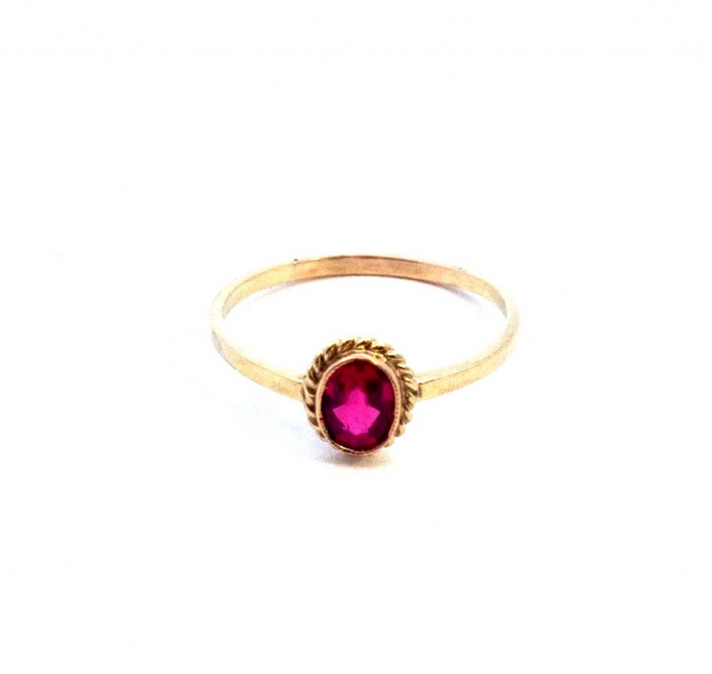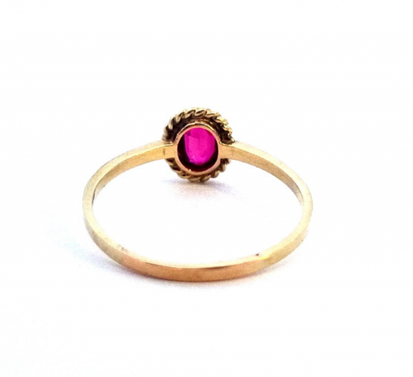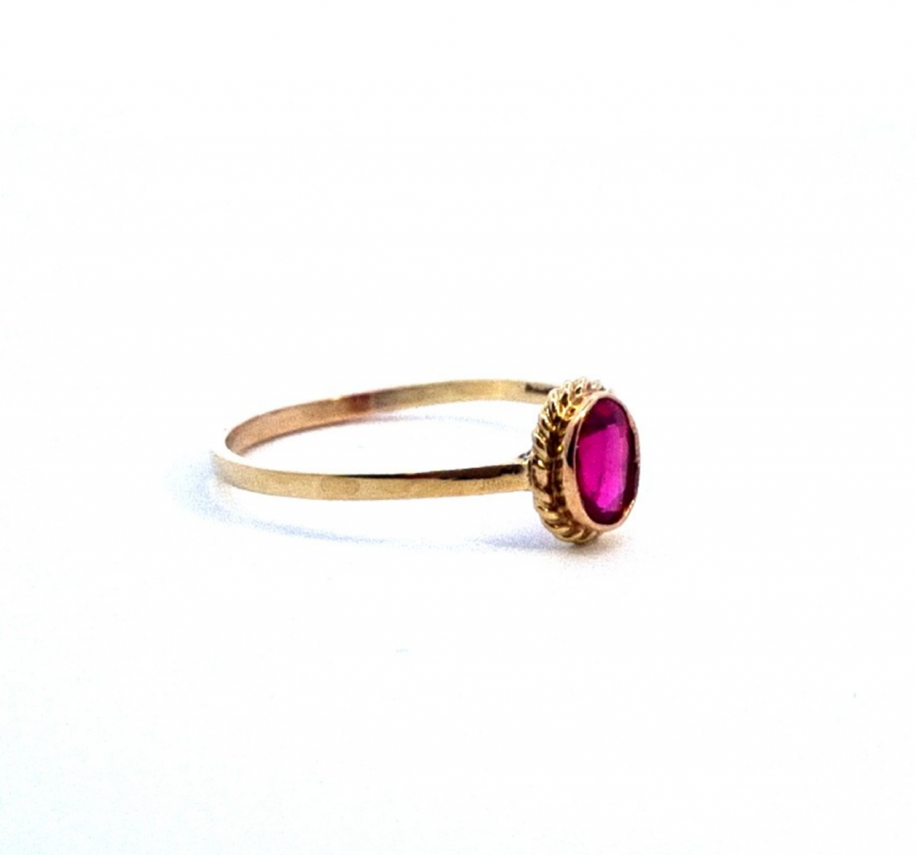 Prsten ze žlutého zlata o ryzosti 585/1000 s puncem labuť. Elegantní tenkou obroučku zdobí rubín o rozměru 6 x 4 mm.