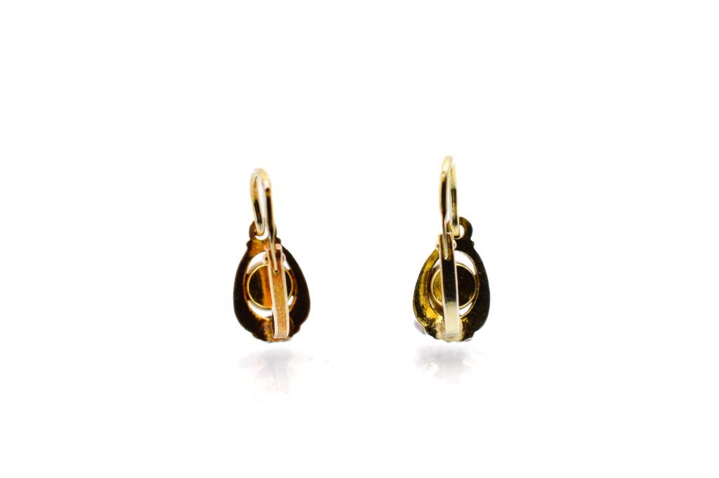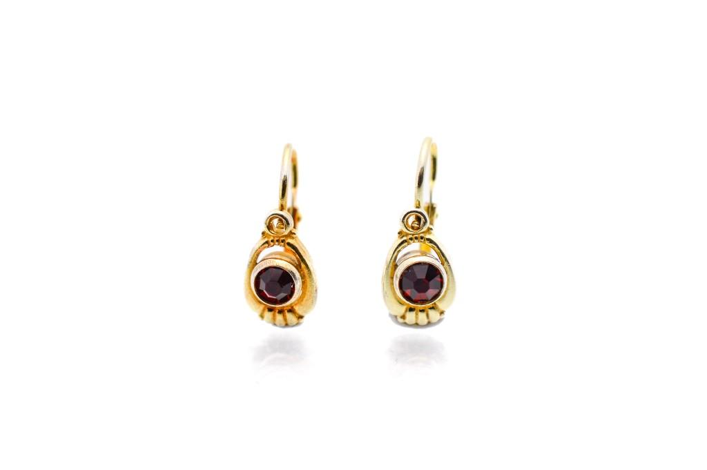 Pozlacené stříbrné náušnice s rubínem, visací. Ryzost 900/1000, punc zajíc. Váha 1,65 g, výška 15 mm, šířka 6 mm. Rubín je syntetický.