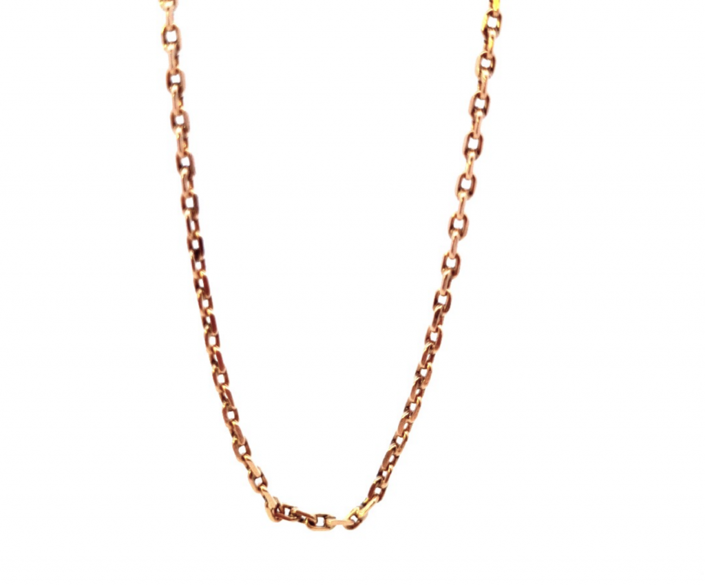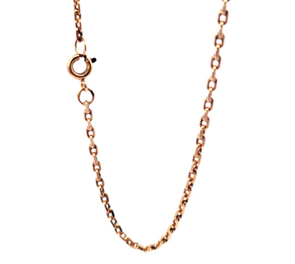 Řetízek z růžového zlata o ryzosti 585/1000, punc čejka. Váha 9,85 g, délka 59 cm, v nejširším bodě 2 mm.