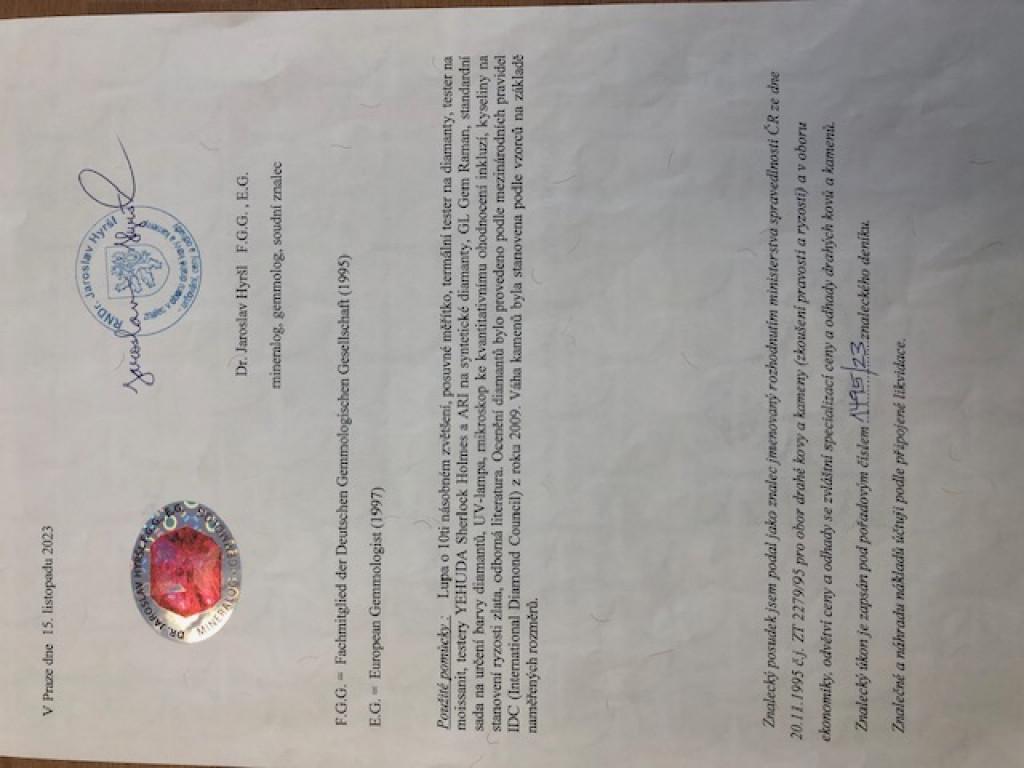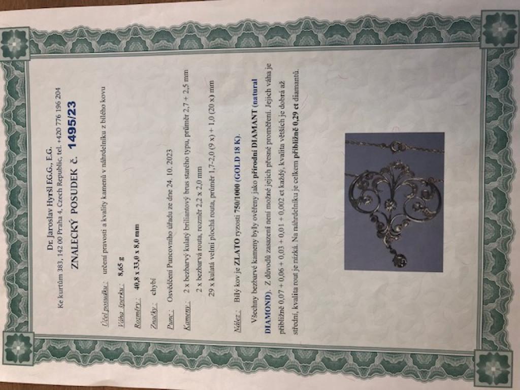 Platinový náhrdelník o ryzosti 900/1000 a zlato 585/1000 o celkové váze 8,65 g, Celková hmotnost diamantů cca 0,29 ct. Šíře náhrdelníku cca 40 mm. Osvědčení z puncovního úřadu a posudek ke kamenům.