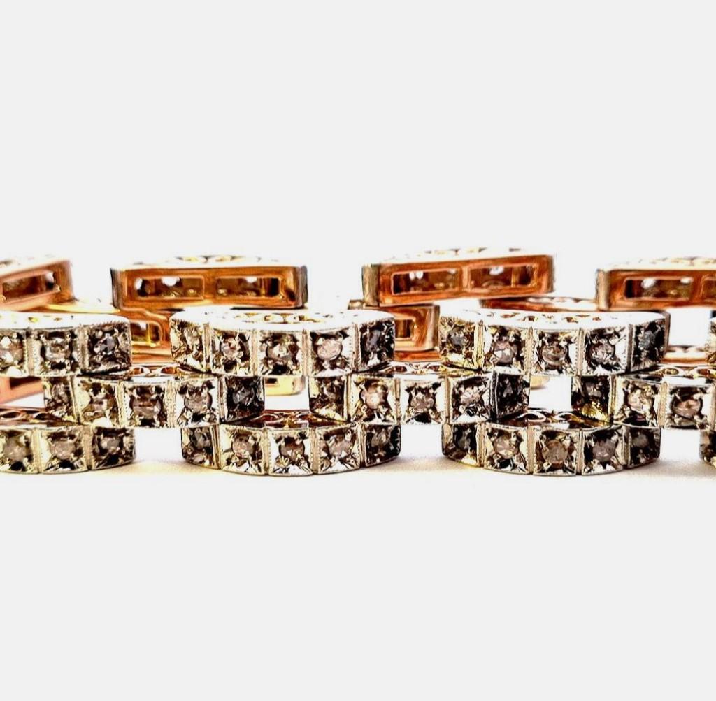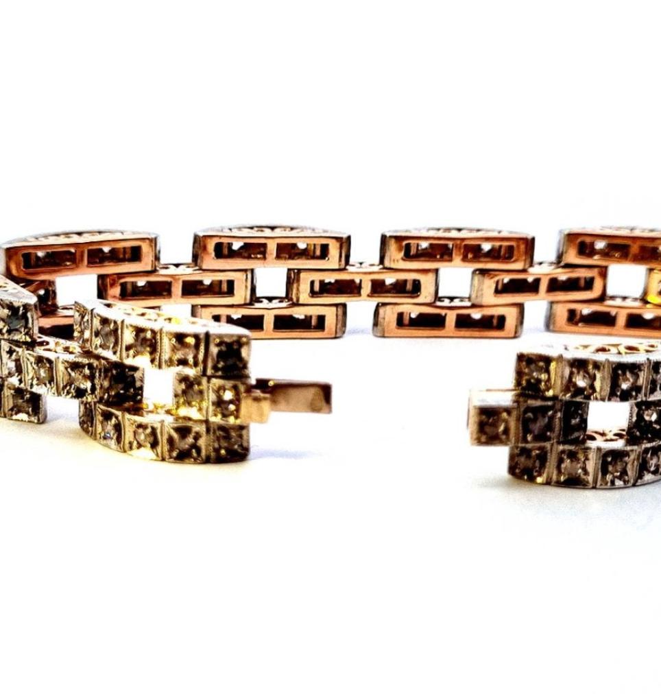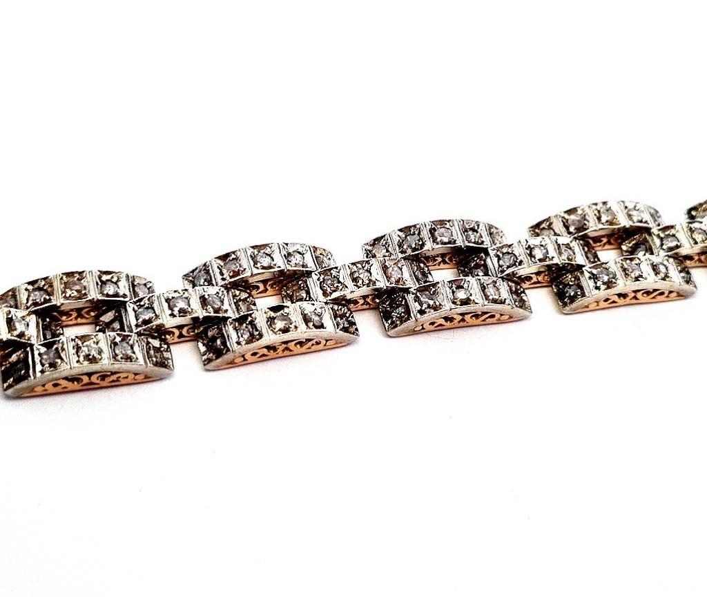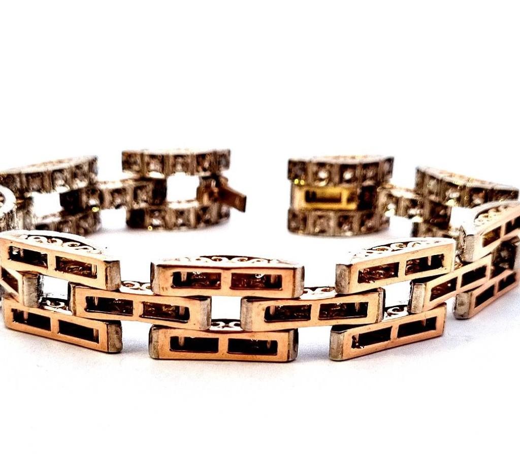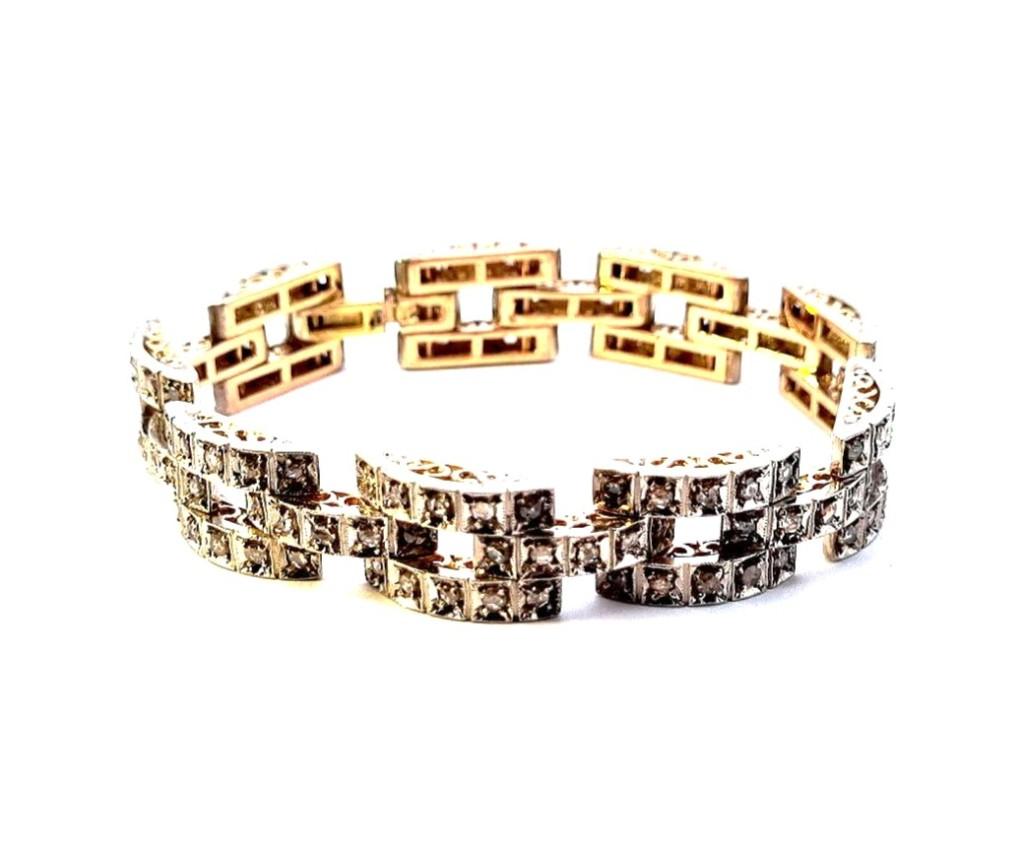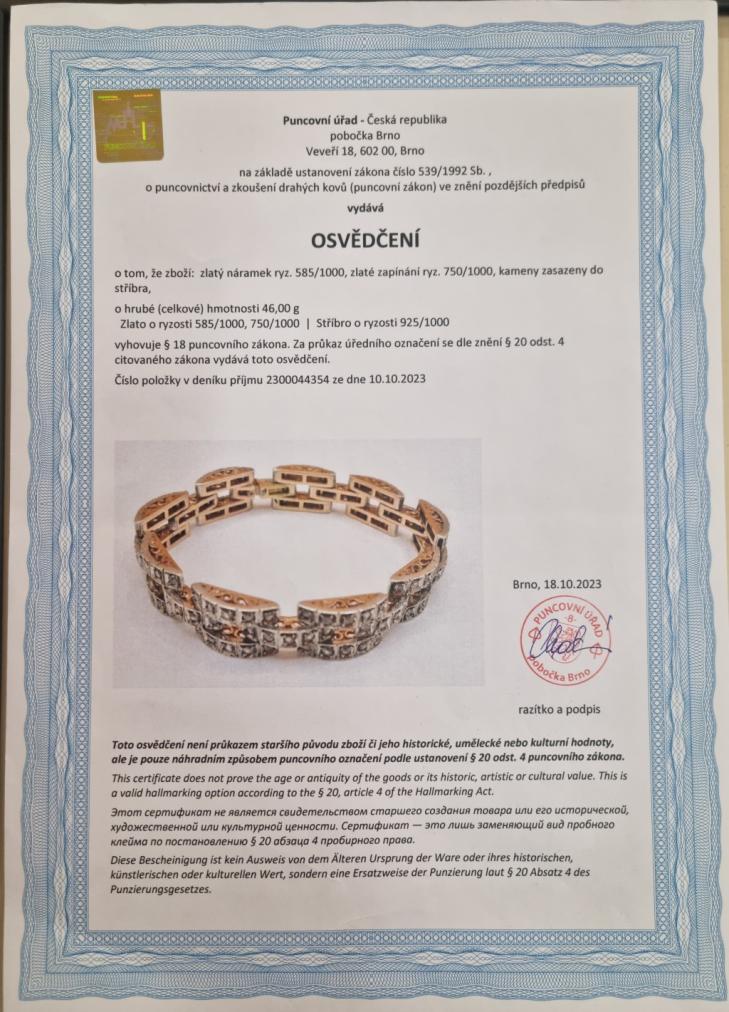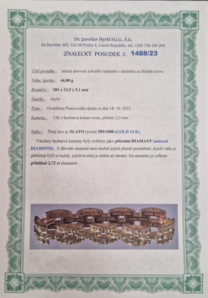 Zlatý náramek o ryzosti 585-750/1000, váze 46 g, kameny zasazeny do stříbra, vnitřní strana náramku je ze žlutého zlata. Diamanty celkem cca 2,72 ct. Osvědčení o ryzosti z puncovního úřadu a posudek ke kamenům. Délka náramku 19,5 cm, šířka 1,3 cm, tloušťka v nejsilnějším bodě 0,5 cm.