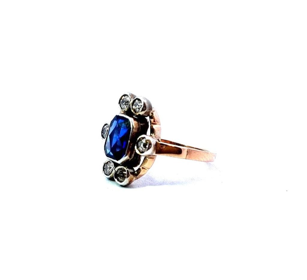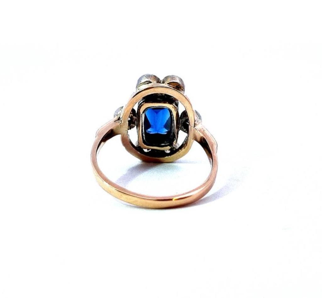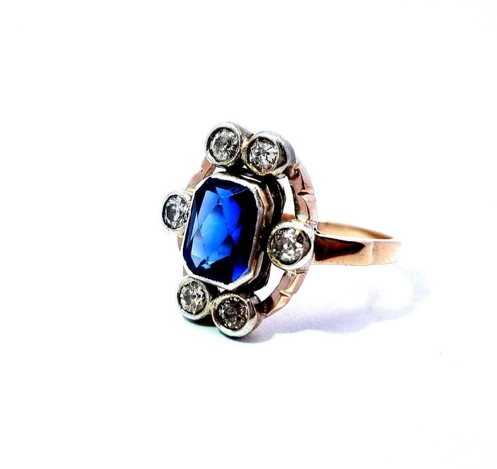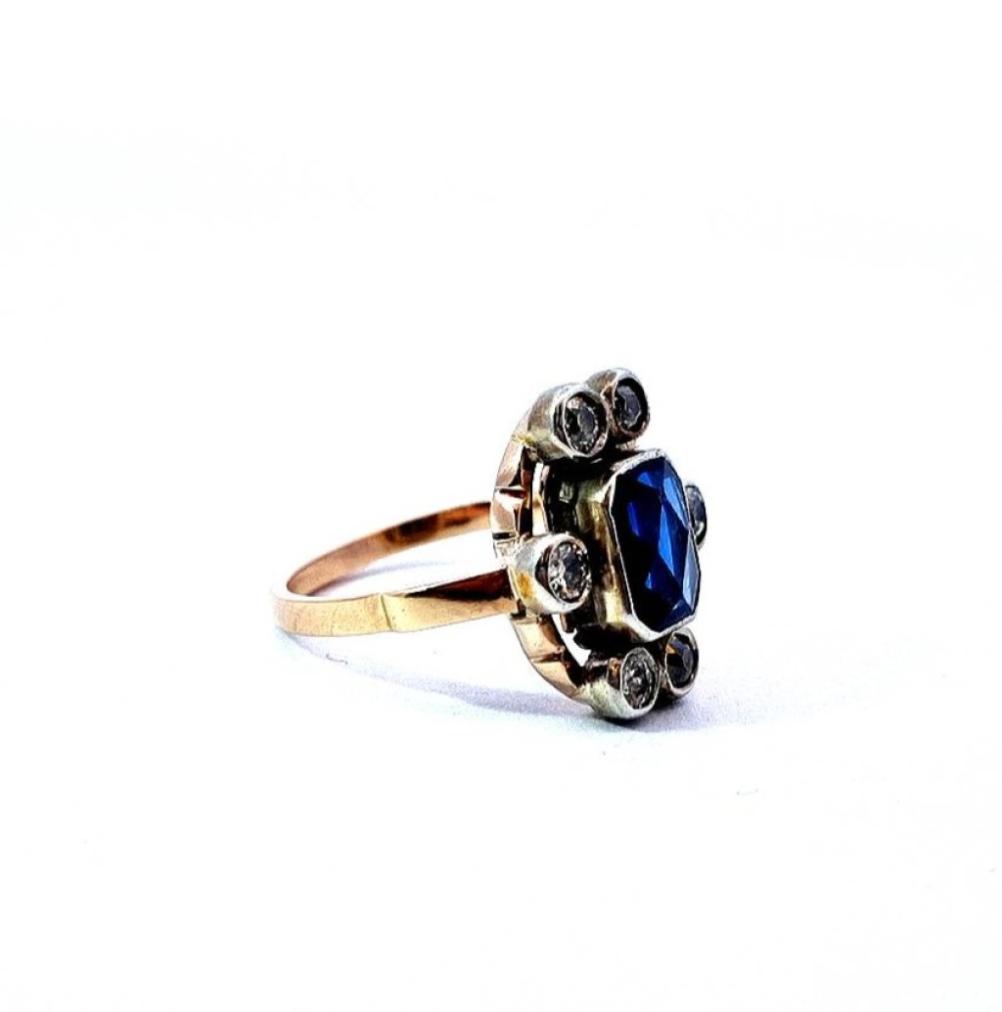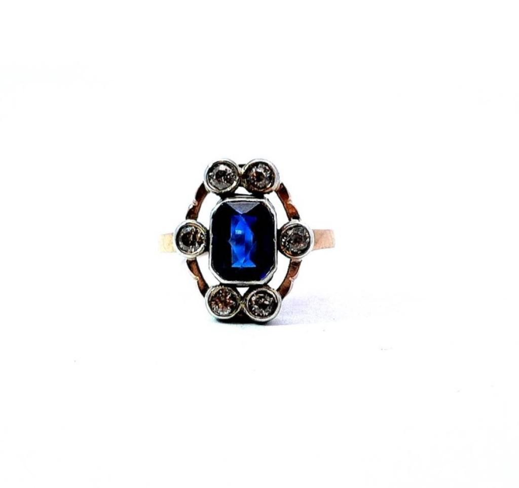 Prsten, šína je zlatá, ryzost nižší než 585/1000, punc Z a slunce, kameny zasazeny do stříbra o ryzosti 900/1000, punc zajíc. Velikost 54, váha 4,09 g, rozměr hlavy prstenu 16 x 14 mm. Kámen - přírodní safír - 1 ks. Kámen - přírodní diamant staroevropského brusu - celkem 6 ks, cca 0,08 ct každý. Dohromady cca 0,48 ct.