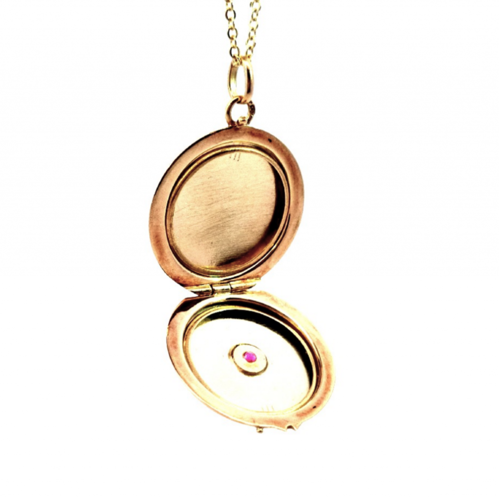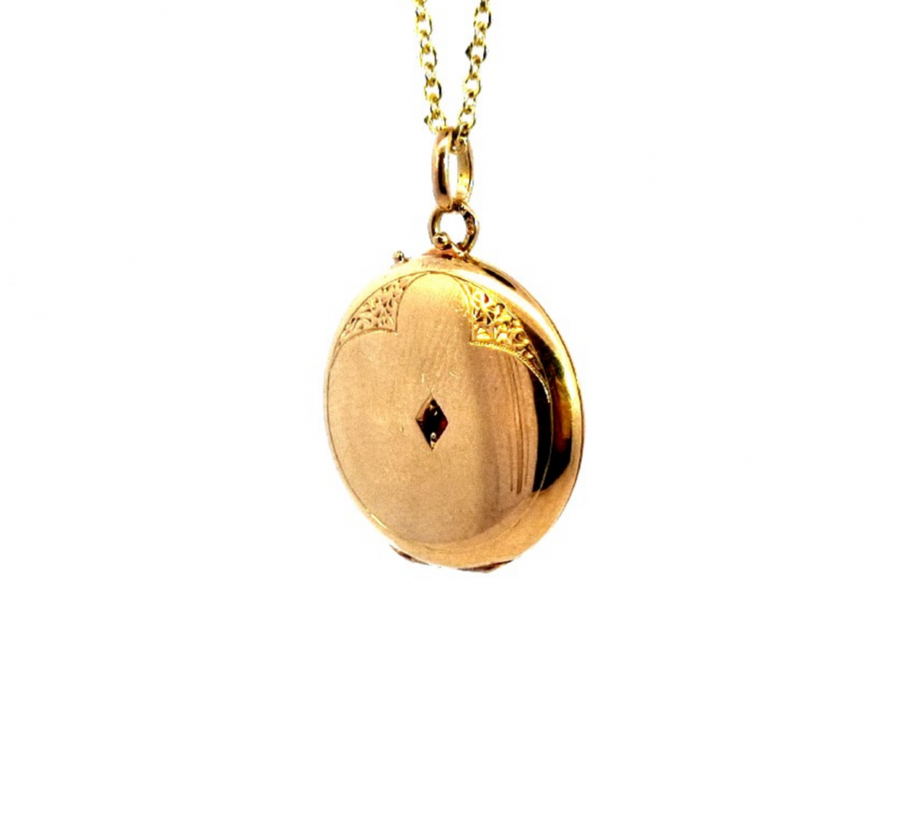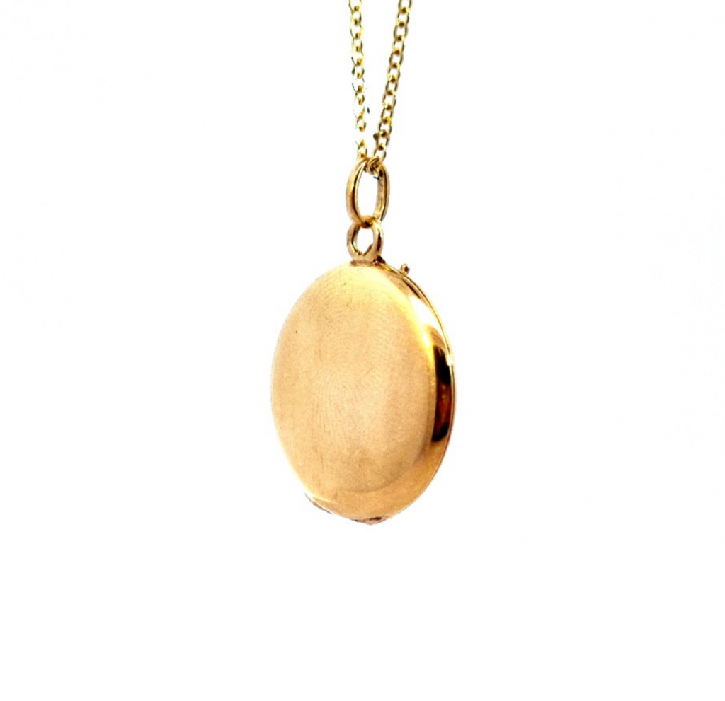 Zlatý medailon o ryzosti 585/1000, punc klas. Váha 3,18 g, výška včetně očka 30 mm, průměr medailonu 22 mm. Kámen je syntetický. Řetízek není součástí přívěsu.