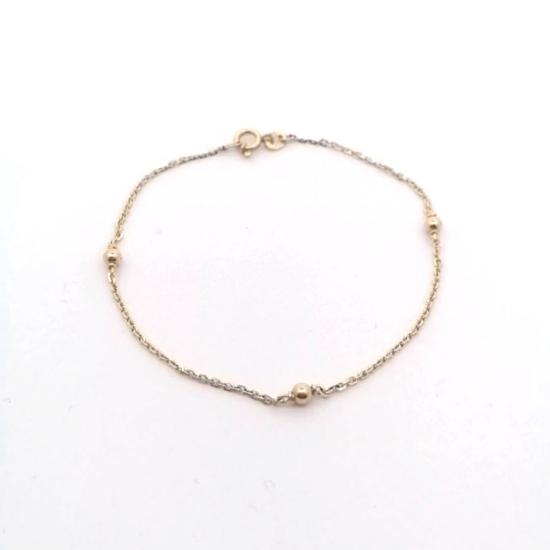 Zlatý náramek o ryzosti 585/1000, punc lyra. Váha 1,51 g, délka 18 cm, šířka 1 mm, průměr kuličky 3 mm.