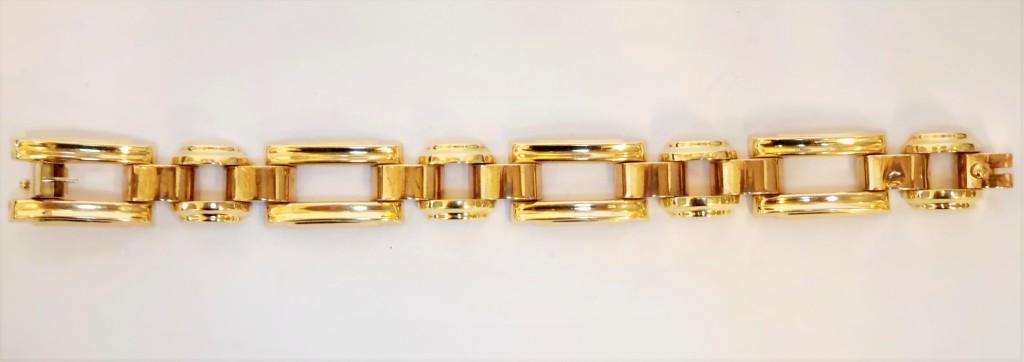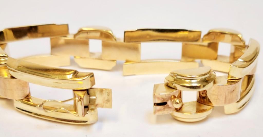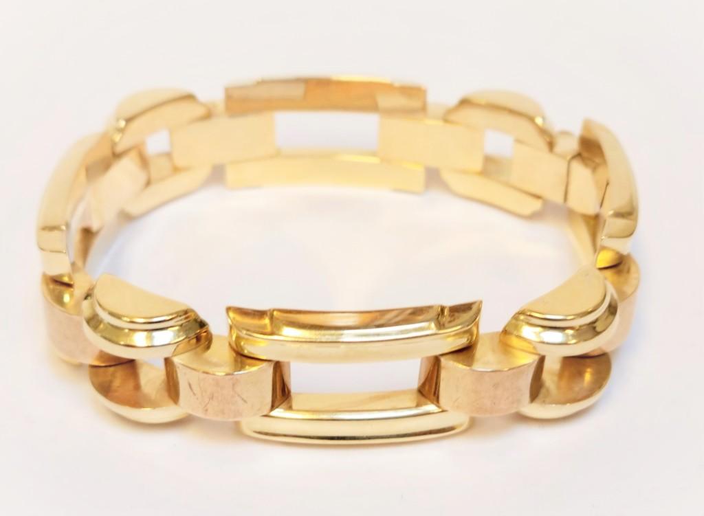Zlatý náramek o ryzosti 585/1000, punc lvíček, váha 32,79g, šířka 17 mm, celková délka i se zapínáním 19 cm.