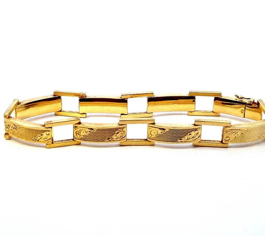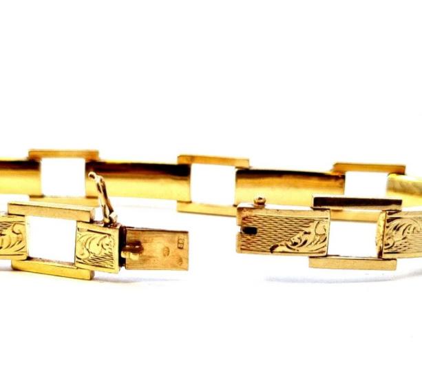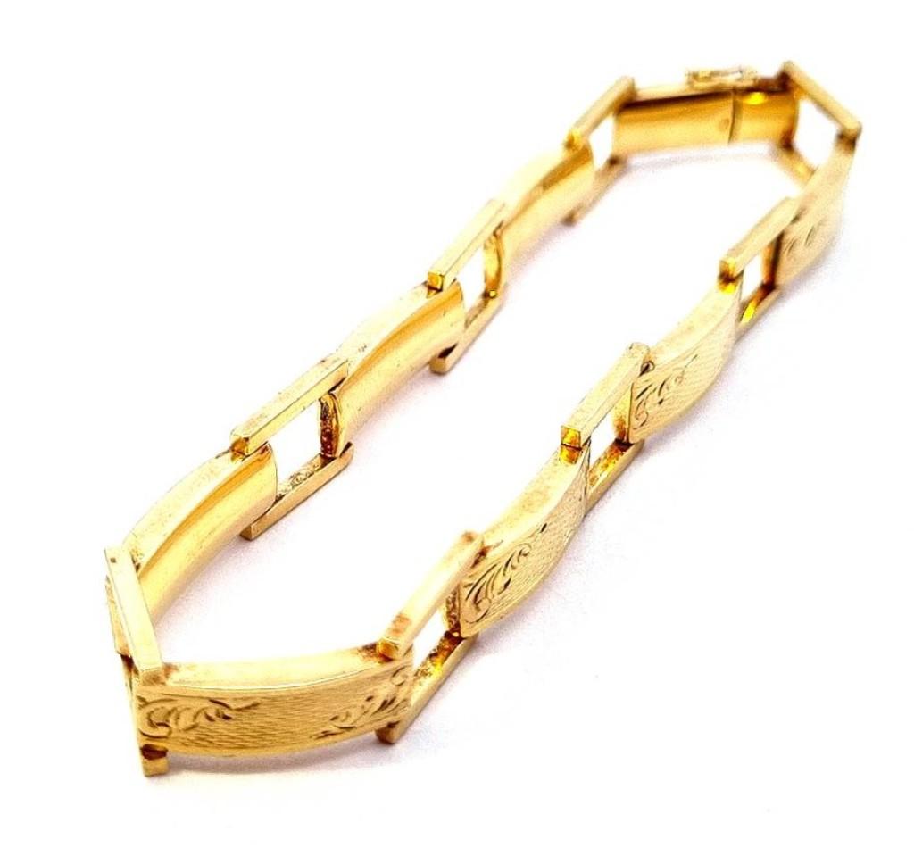 Zlatý náramek o ryzosti 585/1000, punc lvíček. Váha 11,28 g, délka 19 mm, v nejširším bodě 9 mm.