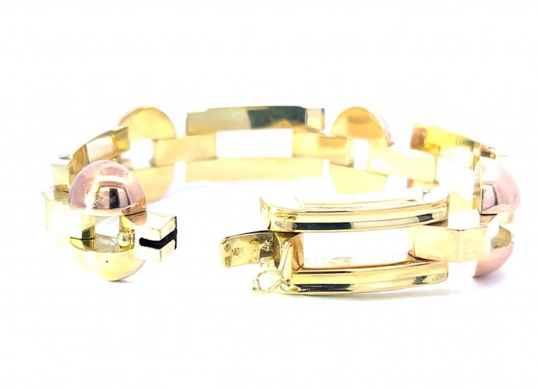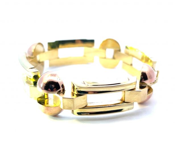 Náramek z kombinace žlutého a růžového zlata o ryzosti 585/1000, punc lvíček. Váha 28,27 g, délka 19 cm, v nejširším bodě 19 mm.