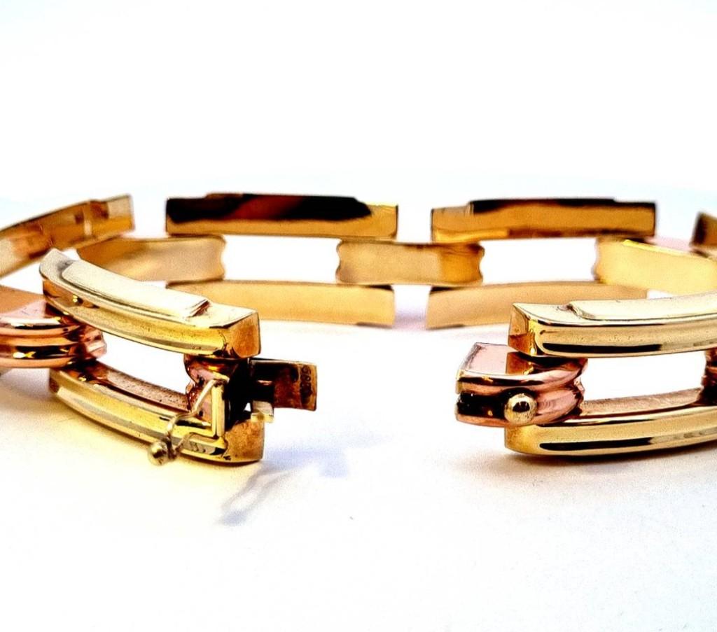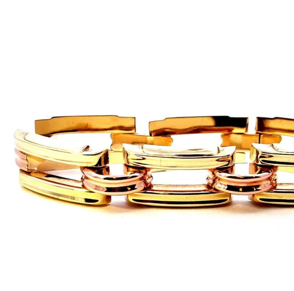 Náramek v kombinaci žlutého a růžového zlata o ryzosti 585/1000, punc lvíček. Váha 29,28 g, délka 18,7 cm, v nejširším bodě 16 mm.