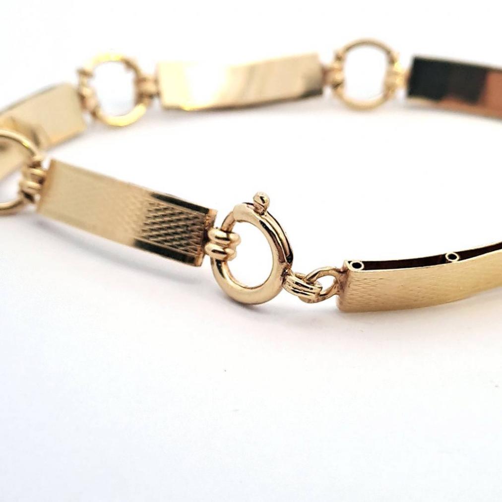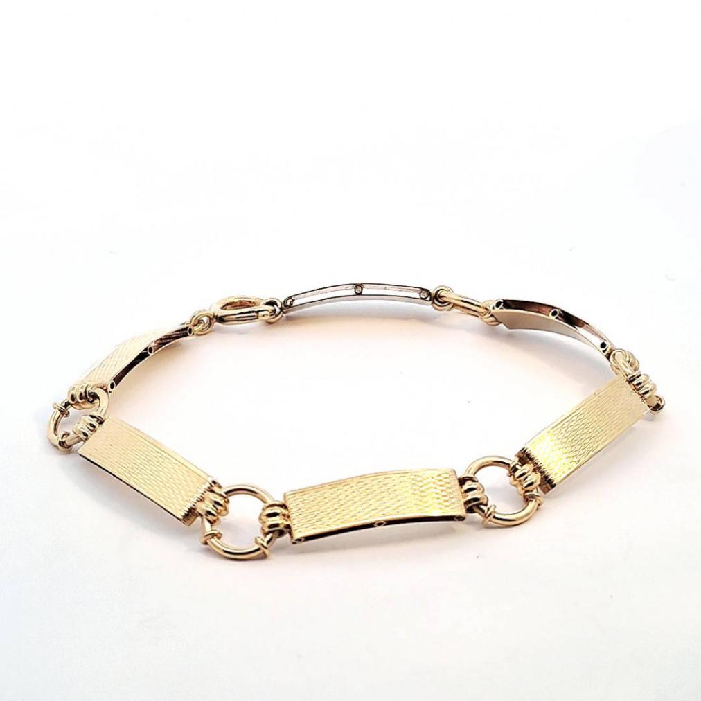 Zlatý náramek o ryzosti 585/1000, punc lvíček. Váha 8,98 g, délka 18 cm, v nejširším bodě 8,5 mm.