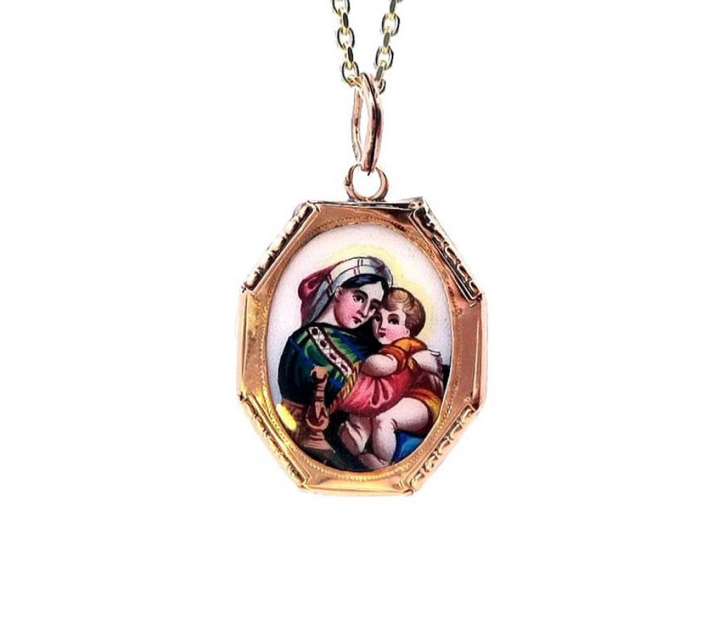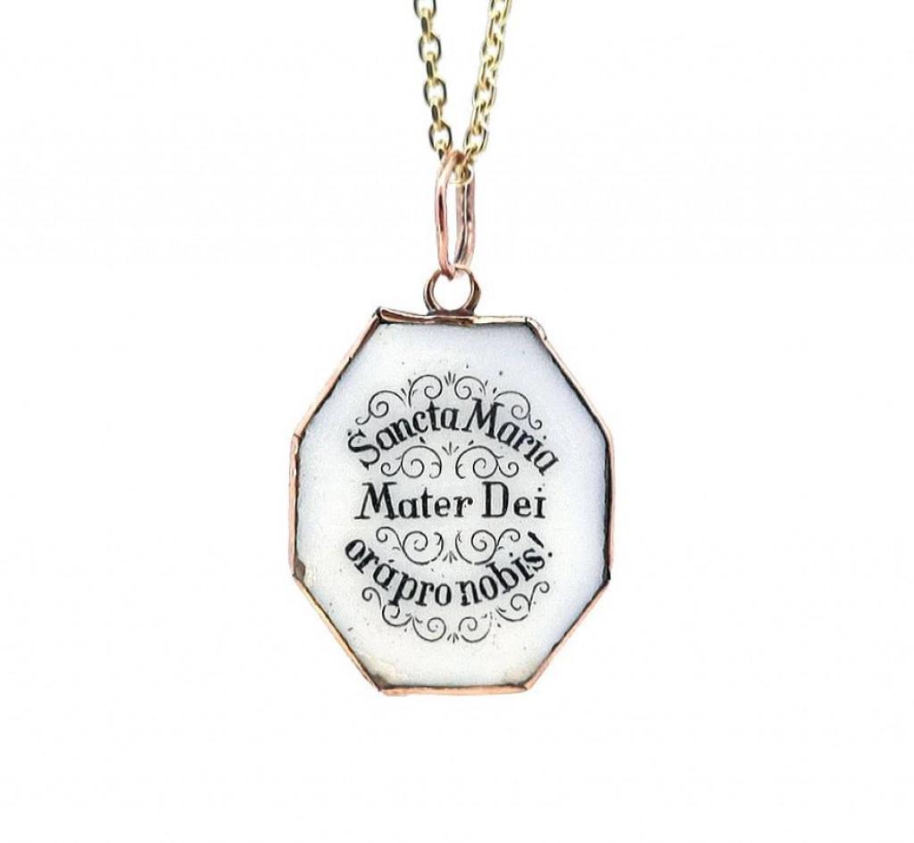 Zlatý přívěs o ryzosti 585/1000, punc liška - Rakousko - Uhersko. Váha 4,08 g, výška včetně očka 34 mm, v nejširším bodě 20,5 mm.