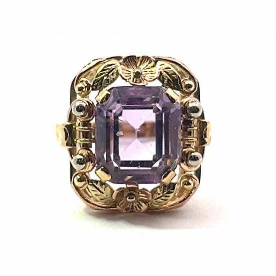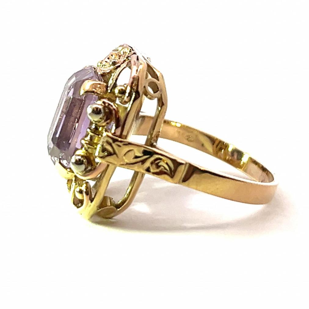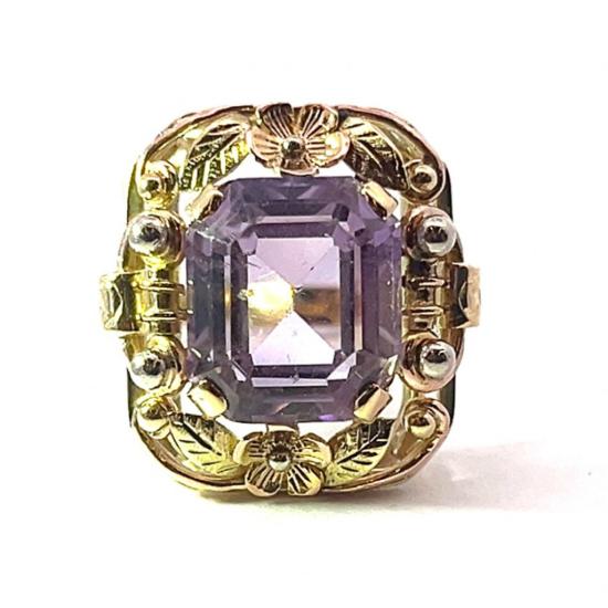 Krásný zdobený starožitný zlatý prsten s fialovým broušeným kamenem o ryzosti 585/1000 s puncem lvíček. Velikost 56, váha 6,20 g, rozměr hlavy prstenu 19 x 18 mm. Rozměry kamenem 12 x 10 mm. Kámen je syntetický.