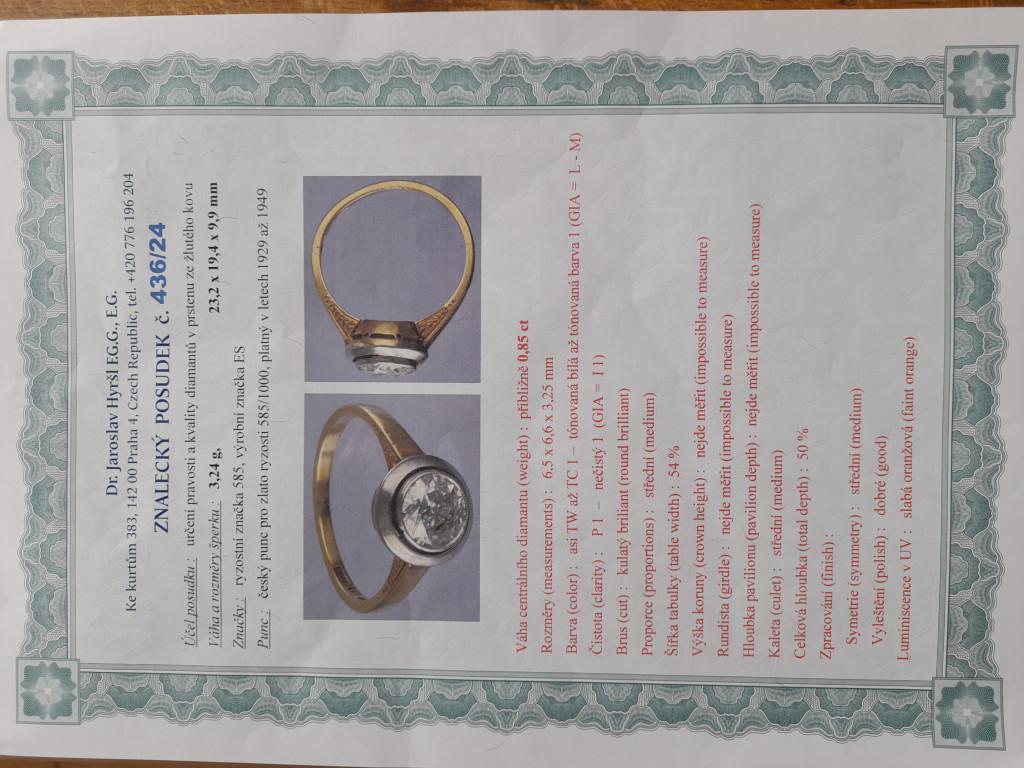 Zlatý prsten s diamantem, vel. 53. Kombinace bílého a žlutého zlata o ryzosti 585/1000, punc lvíček. Váha 3,24 g. Diamant je přírodní, brus briliantový, barva TW až TC 1, čistota P 1, cca 0,85 ct.