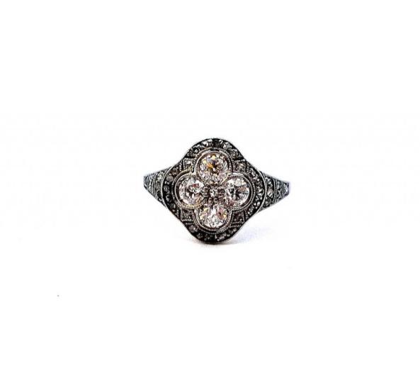 Zlatý prsten o ryzosti 585/1000, punc kukuřičný klas. Velikost 51, váha 2,67 g, v nejširším bodě 13 mm. Kámen - přírodní diamant staroevropského brusu - centrální kameny - 4 ks, cca 0,20 ct každý, menší kámen uprostřed cca 0,005 ct - dohromady cca 0,805 ct. Okolní kameny - přírodní diamant routa - 36 ks.