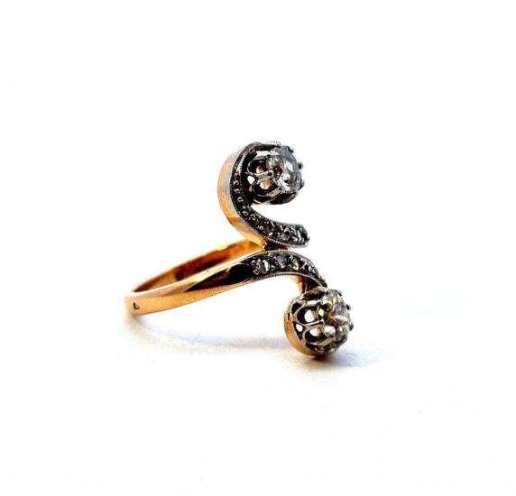 Prsten z kombinace zlata o ryzosti 750/1000, punc kohout, a platiny o ryzosti 950/1000, punc korunka. Velikost 52, váha 5,45 g, v nejširším bodě 22 mm. Kámen - diamant staroevropského brusu - centrální kameny - 2 ks, dohromady cca 0,78 ct. Okolní kameny - přírodní diamant routa - 12 ks.