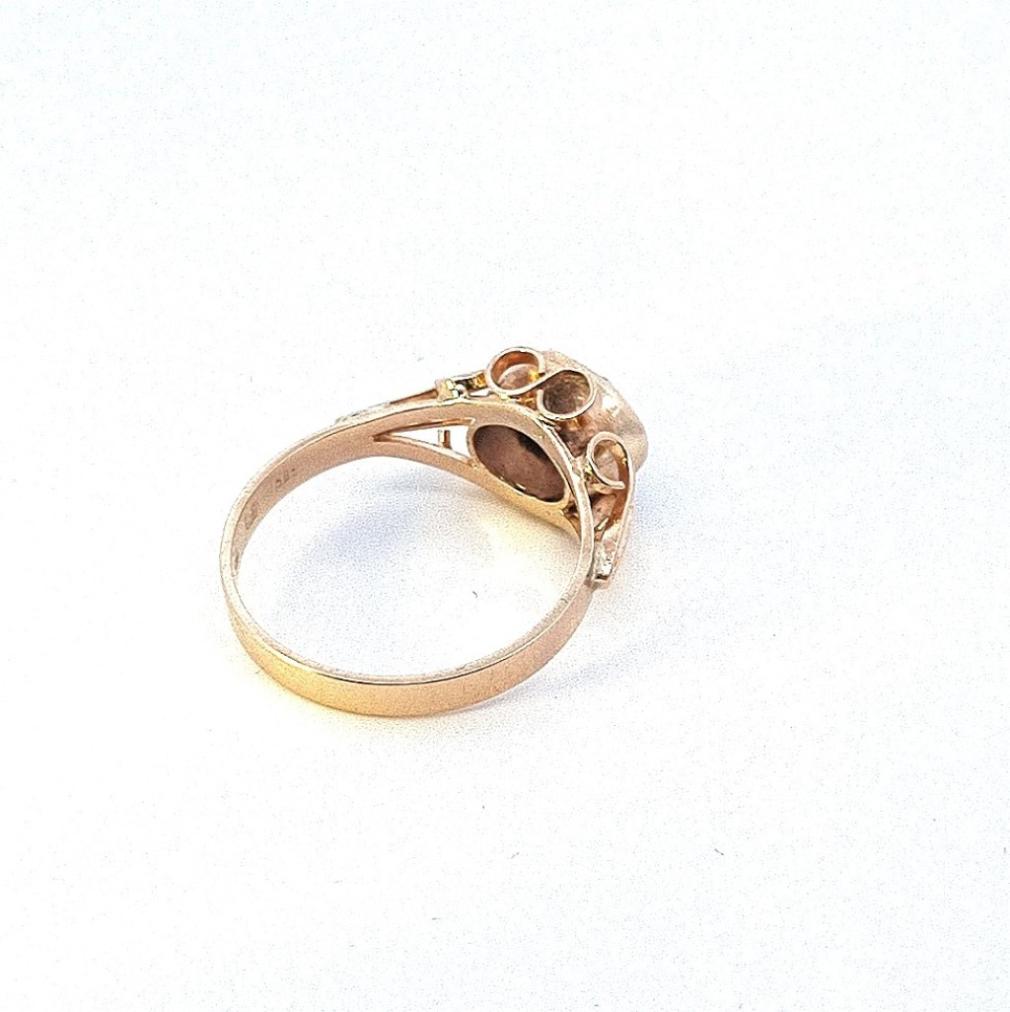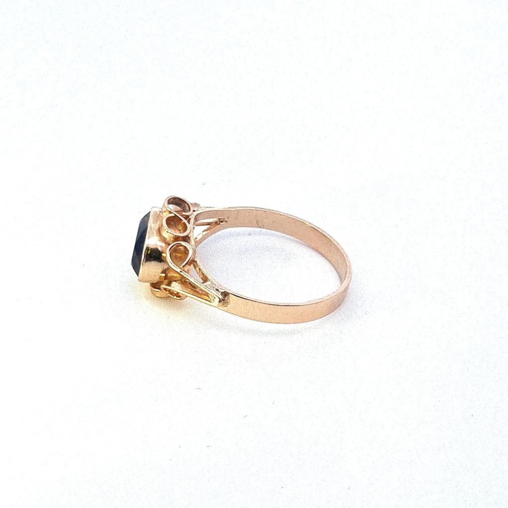 Zlatý prsten o ryzosti 585/1000, punc kukuřičný klas , váha 2,61 g, velikost 53,5, v nejširším bodě 9 mm, rozměry kamene - výška 7 mm, výška 9 mm. Kámen je syntetický.