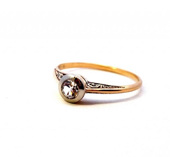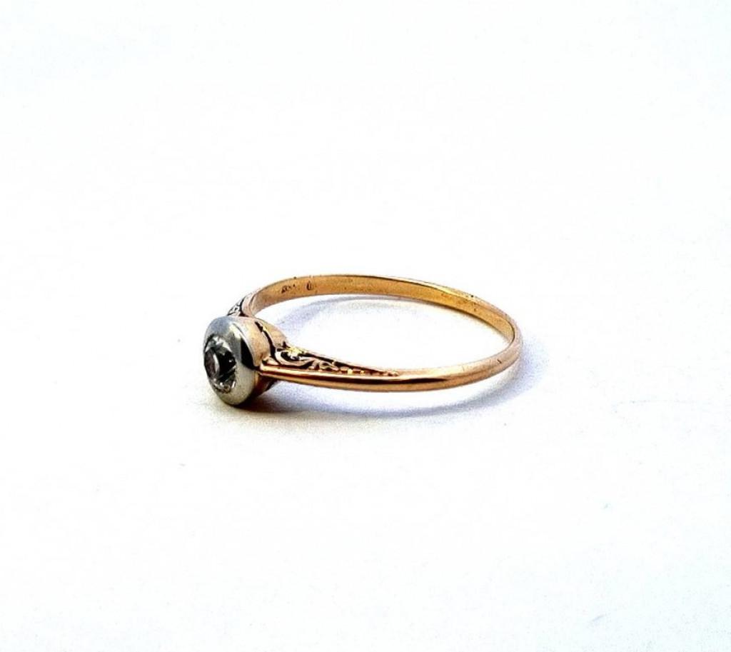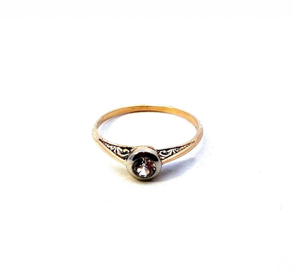 Zlatý prsten ze žlutého zlata o ryzosti 585/1000, punc labuť, váha 1,75 g, velikost 57, v nejširším bodě 6 mm. Prsten je z období 1. republiky, nově opuncován současným puncem.