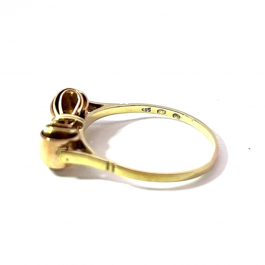 Prsten z kombinace žlutého a růžového zlata o ryzosti 585/1000, punc lvíček. Velikost 62, váha 2,89 g, v nejširším bodě 7,5 mm.