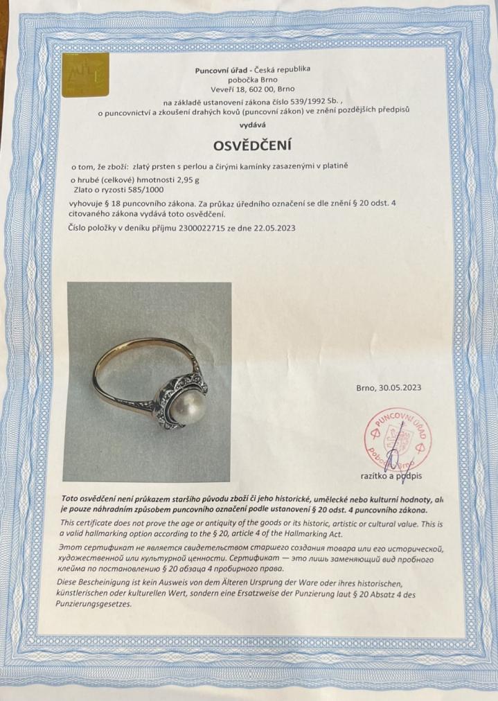 Zlatý prsten o ryzosti 585/1000, osvědčení z puncovního úřadu, kameny zasazeny v platině, váha 2,95 g, velikost 54, v nejširším bodě 11 mm, průměr perly 6 mm. Kámen - diamantová routa - celkem 8 ks, cca 0,08 ct.