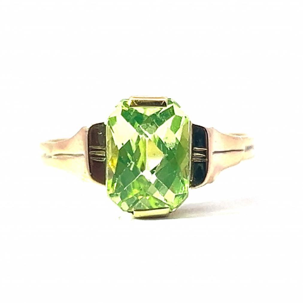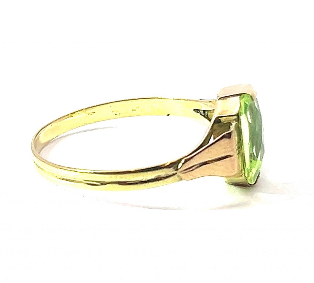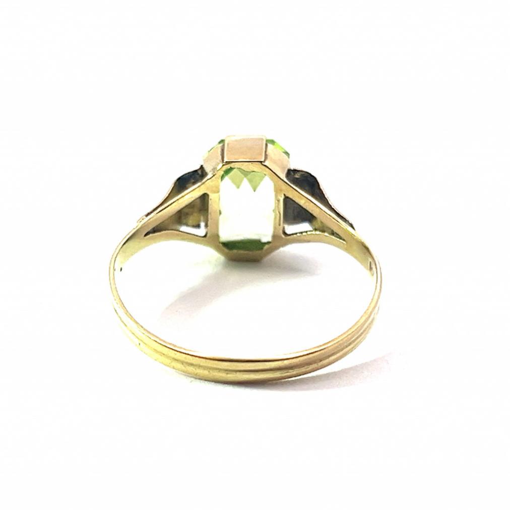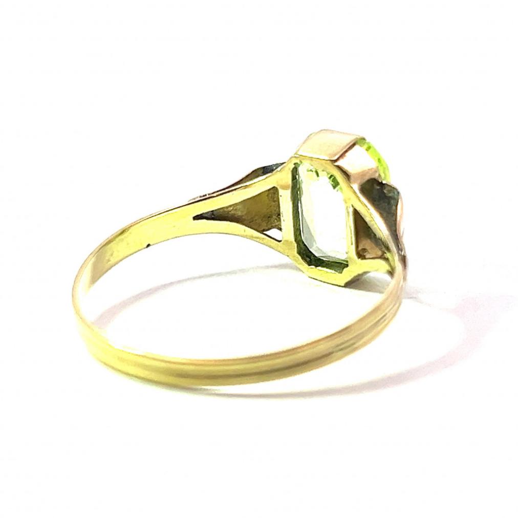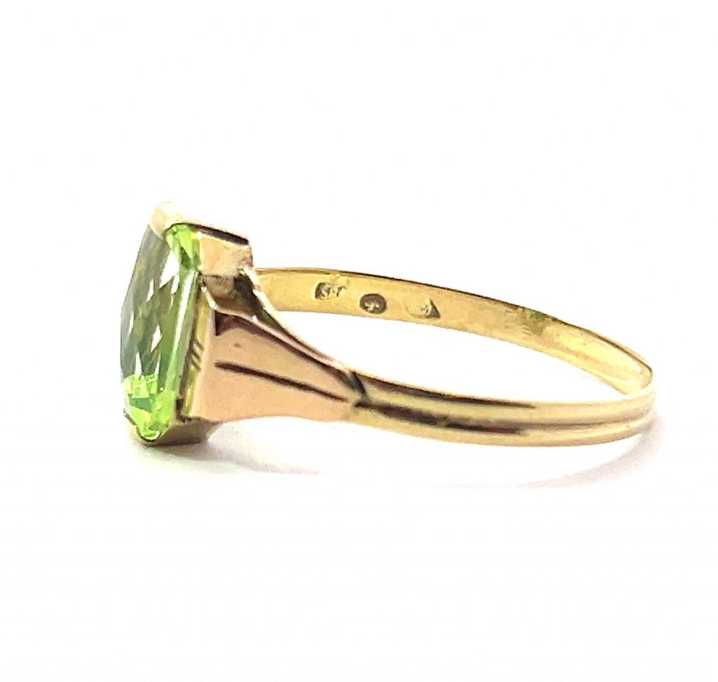 Starožitný zlatý prsten se světle zeleným průsvitným kamenem o ryzosti 585/1000 s puncem lvíček. Váha 1,99 g, velikost 60, rozměr kamene 11 x 7 mm. Kámen je syntetický.