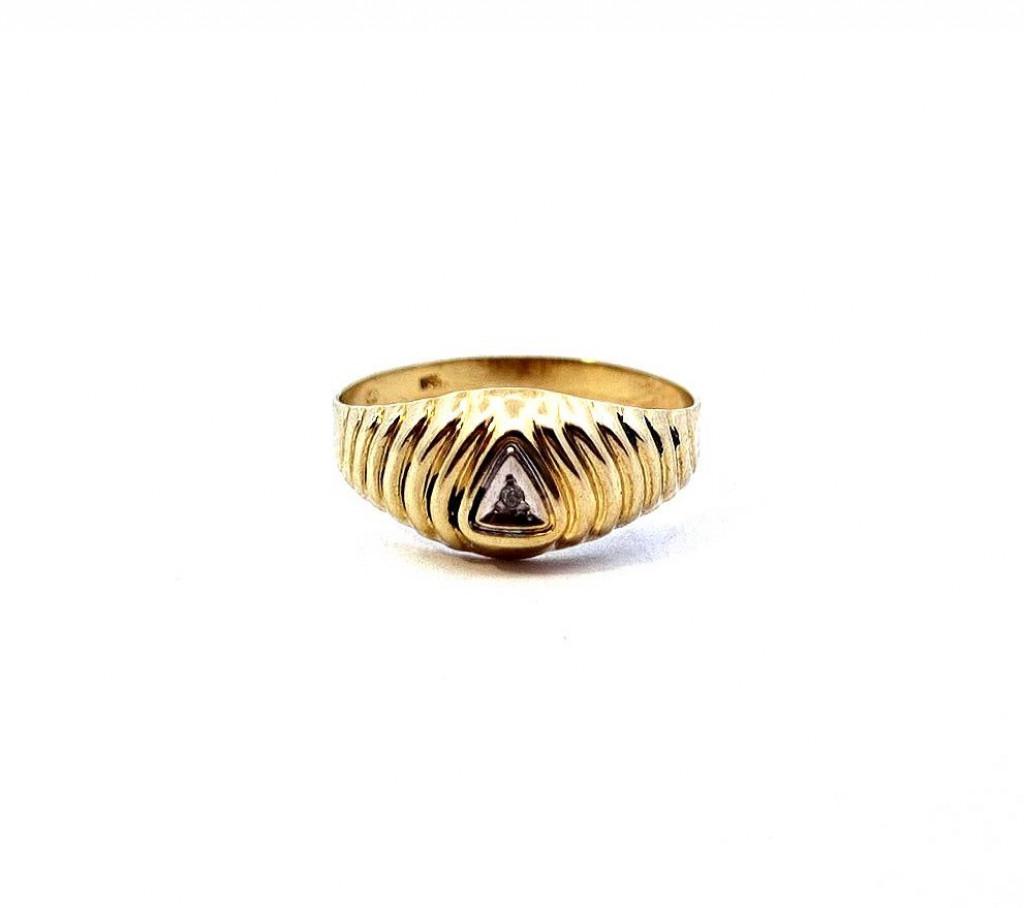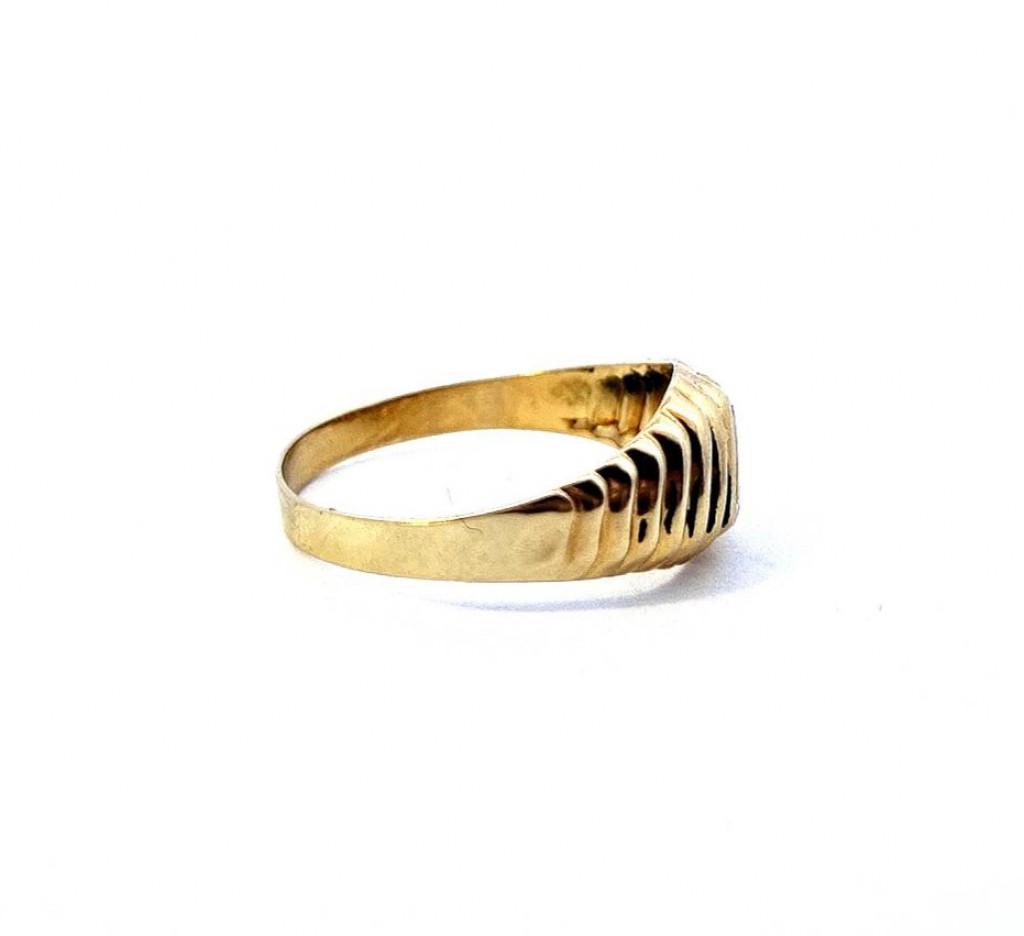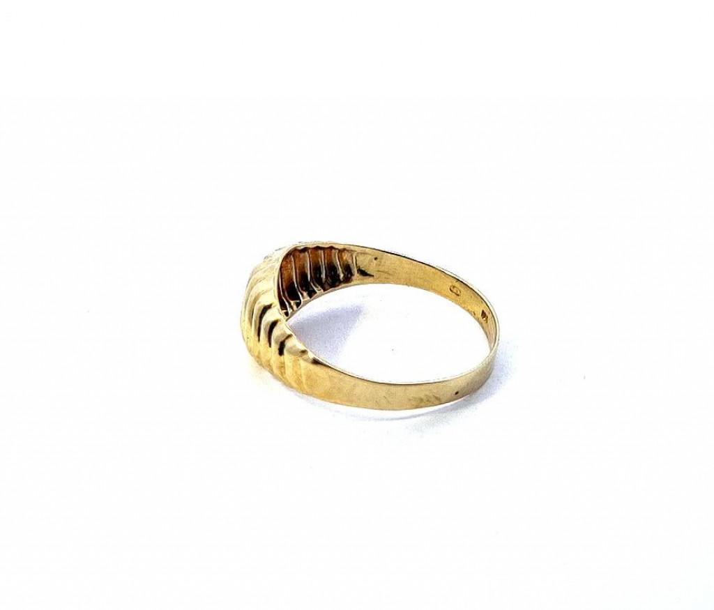 Prsten ze žlutého zlata o ryzosti 585/1000, punc lyra. Velikost 56, váha celkem 1,60 g, v nejširším bodě 8 mm.