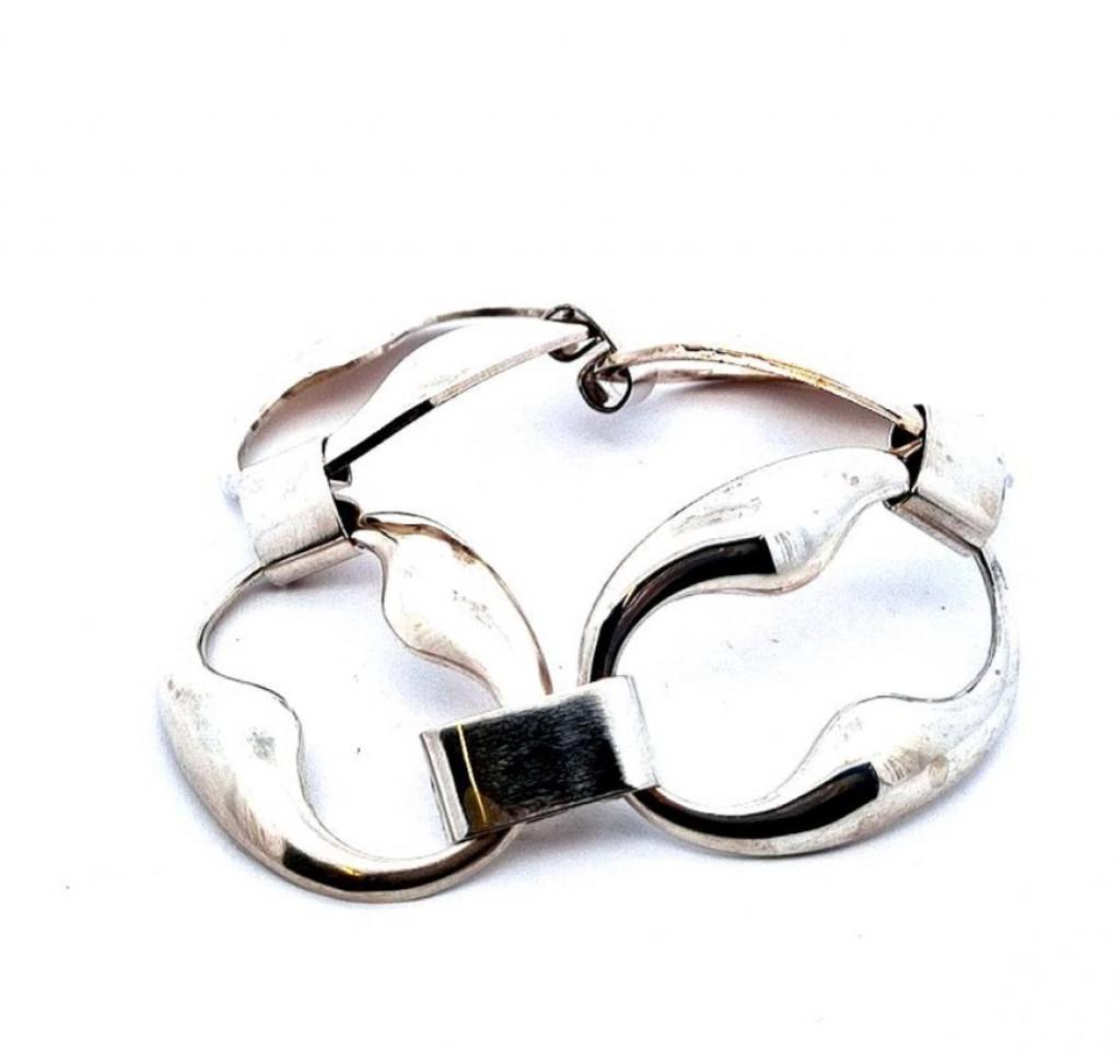 Stříbrný náramek o ryzosti 800/1000, punc zajíc. Váha 35,92 g, délka 19,4 cm, v nejširším bodě 32 mm.