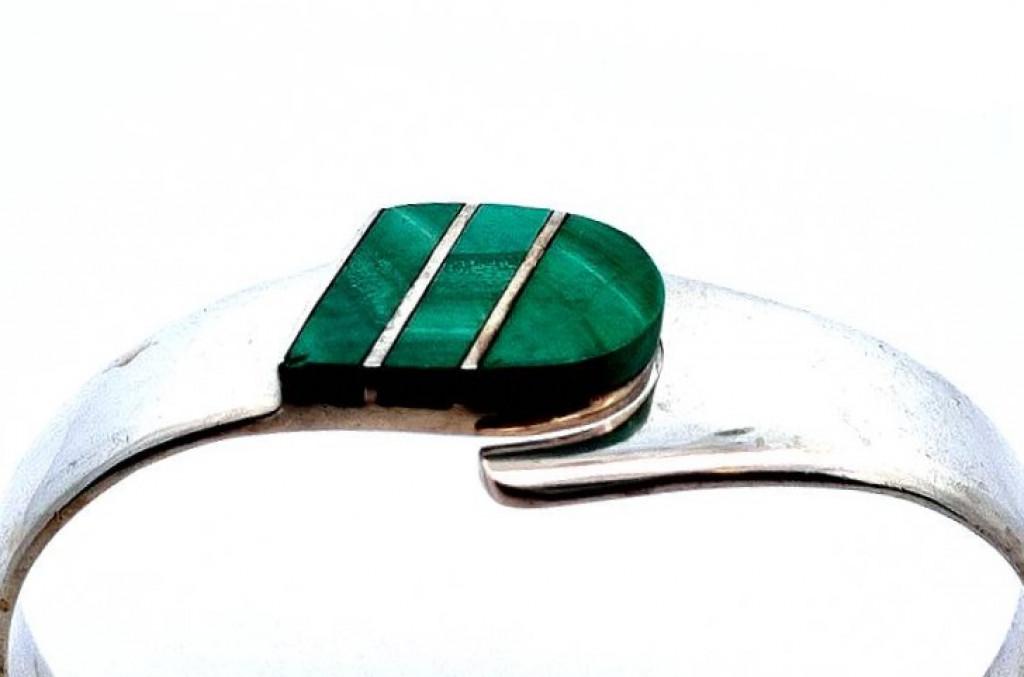 Stříbrný náramek o ryzosti 925/1000, punc kamzík. Váha 55,95 g, vnitřní průměr 65 mm, v nejširším bodě 23 mm.