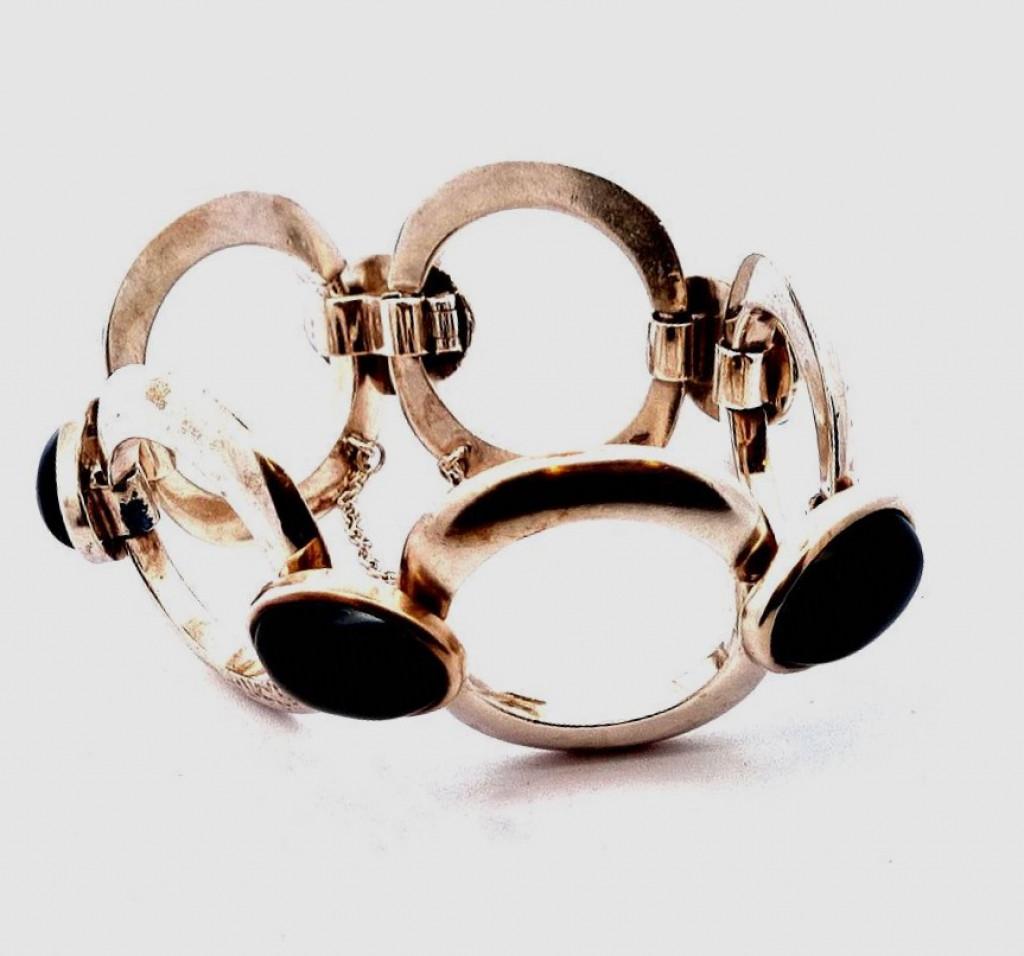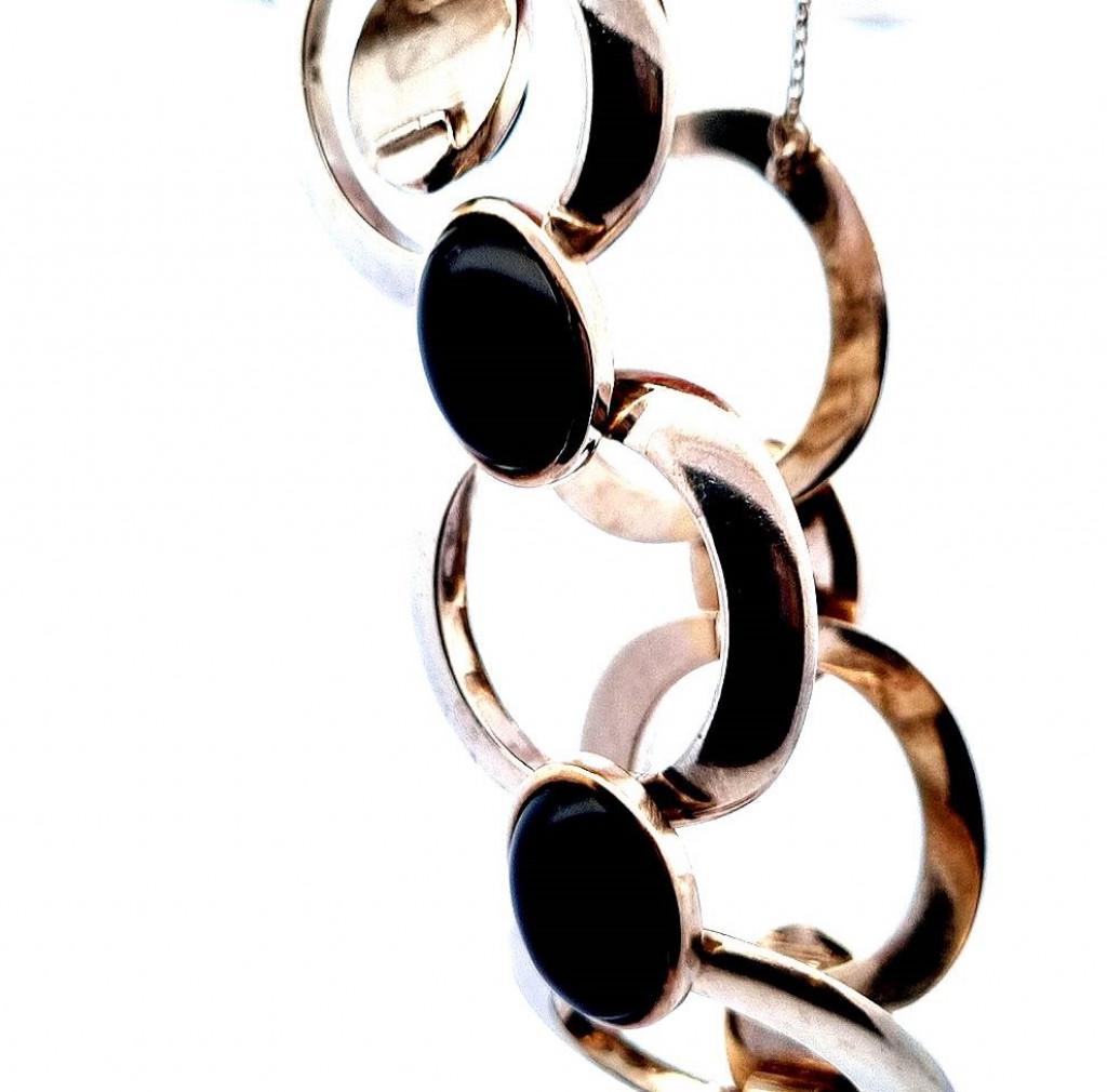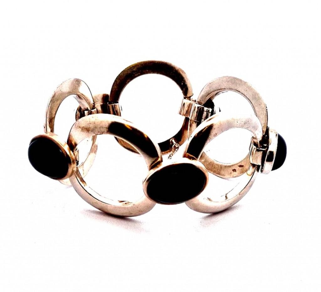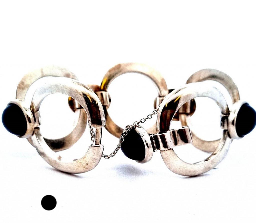 Stříbrný náramek o ryzosti 959/1000, punc kamzík. Váha 93,23 g, vnitřní průměr cca 62 mm, v nejširším bodě 35 mm.