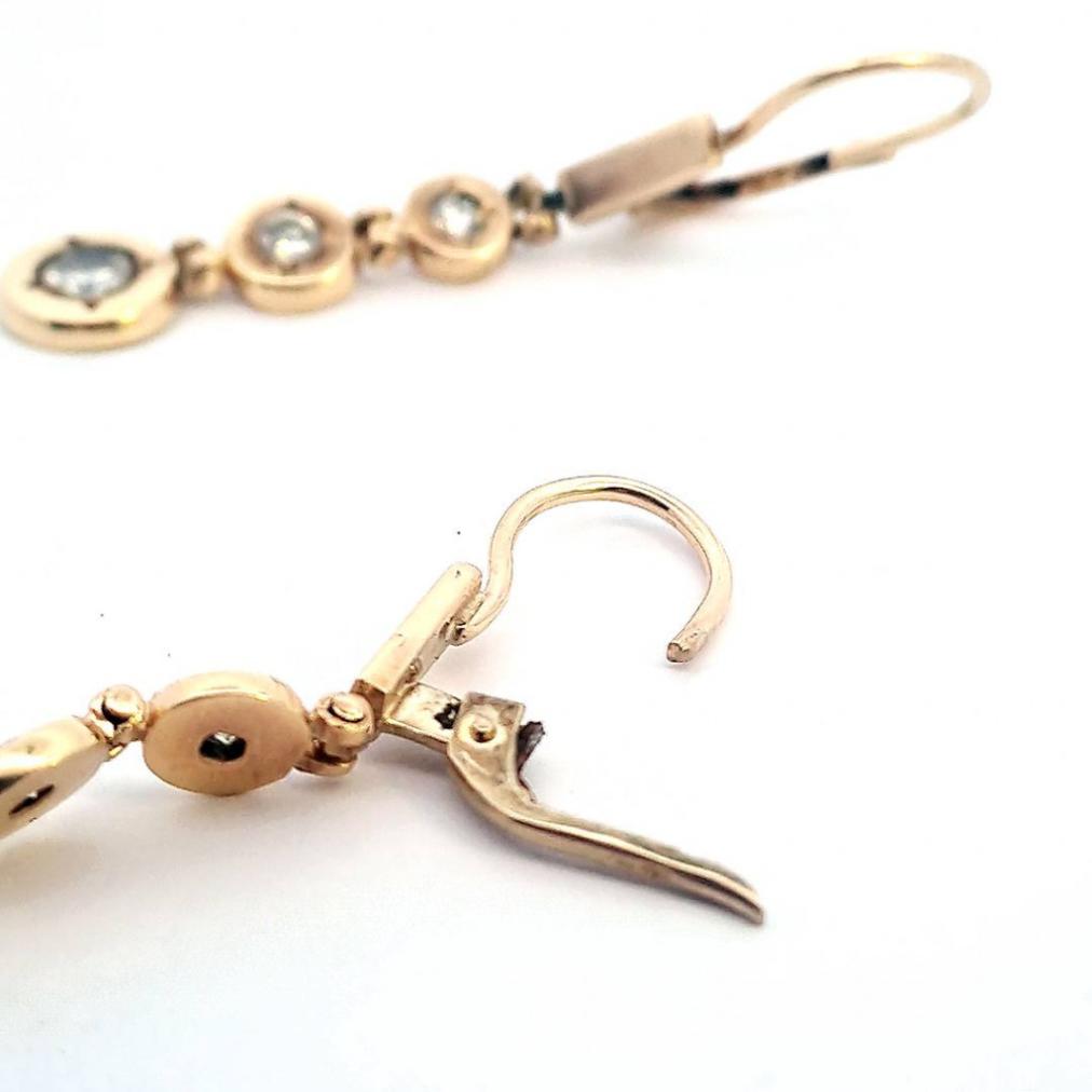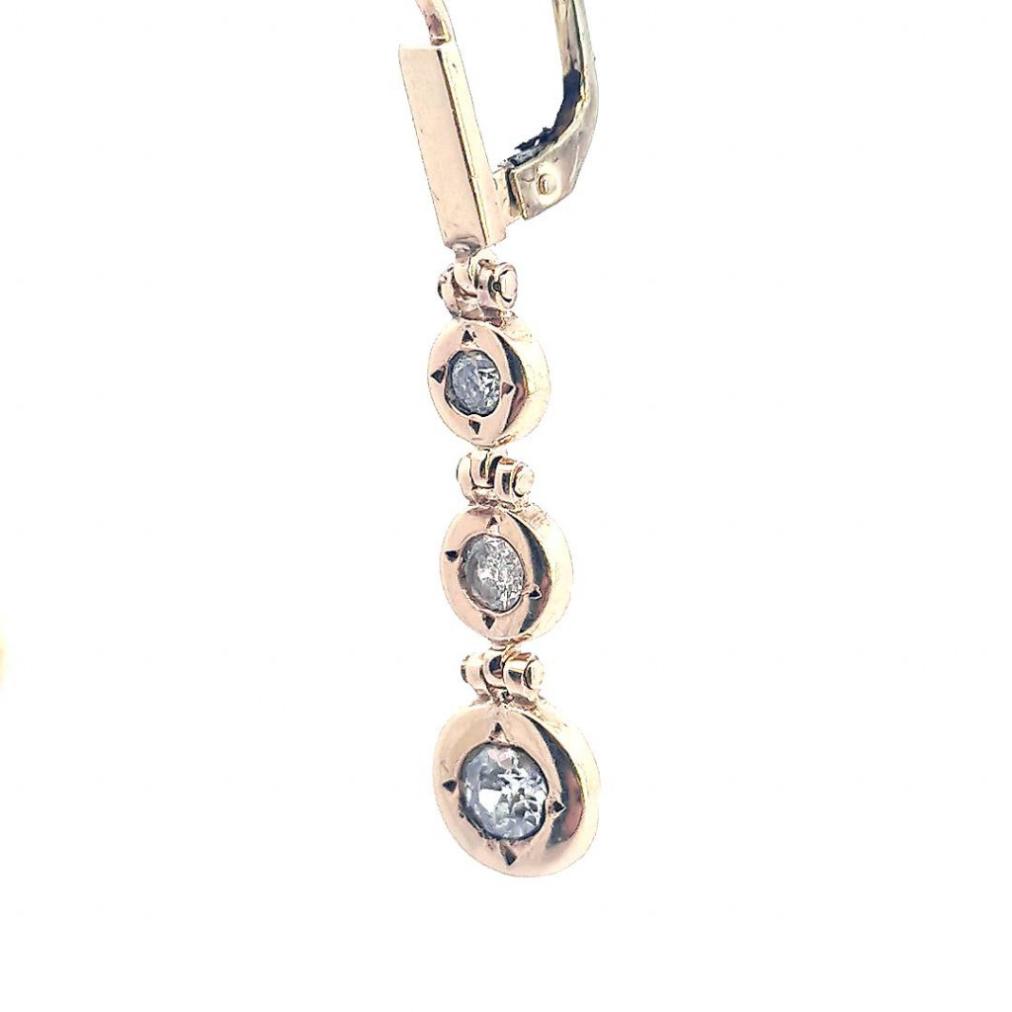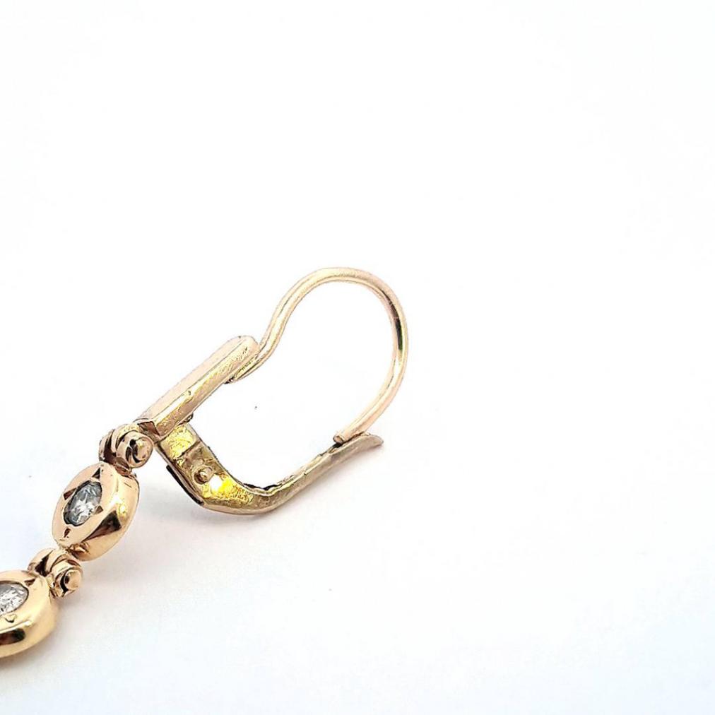 Zlaté visací náušnice zdobené brilianty. Zlato o ryzosti 585/1000 s puncem labuť. Celková váha je 4,39 g. Na délku měří 42 mm. V nejširším bodě měří 7 mm. Čiré kameny jsou přírodní diamanty briliantového brusu a mají dohromady cca 0,60 ct.