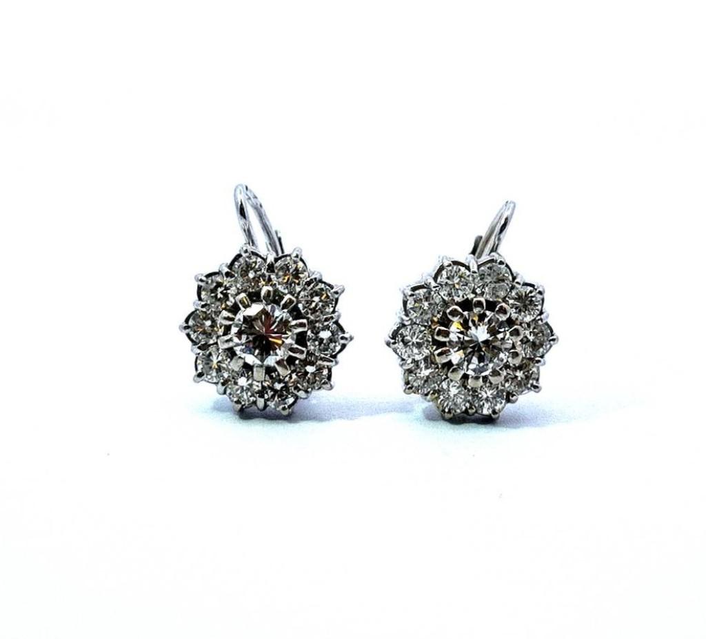 Zlaté náušnice o ryzosti 585/1000, punc labuť. Váha 5,70 g, výška 17 mm, průměr ozdoby 12,5 mm. Kámen - přírodní diamant briliantového brusu - centrální kámen - 2 ks, cca 0,25 ct každý, okolní kameny: 20 ks, cca 0,08 ct každý. Dohromady 22 ks, cca 2,1 ct.