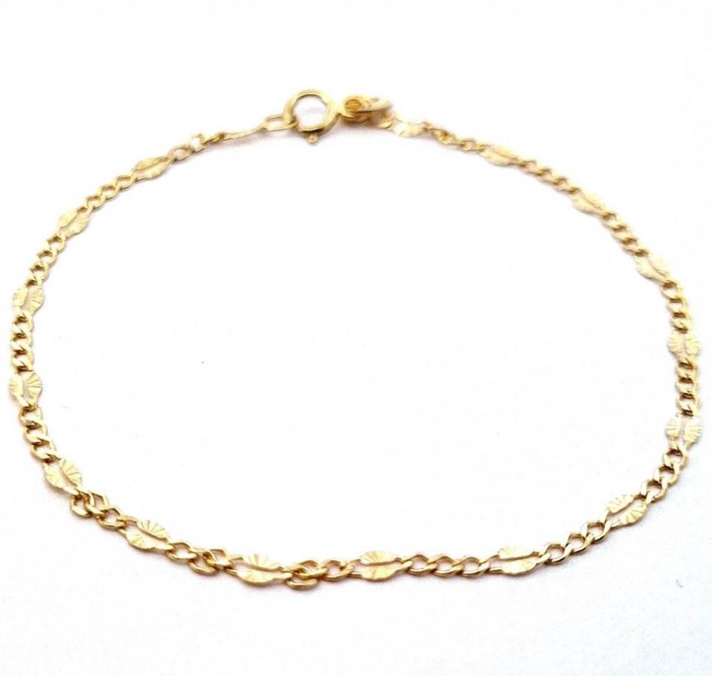 Zlatý náramek o ryzosti 585/1000, punc labuť. Váha 0,88 g, délka 17 cm, v nejširším bodě 2 mm.