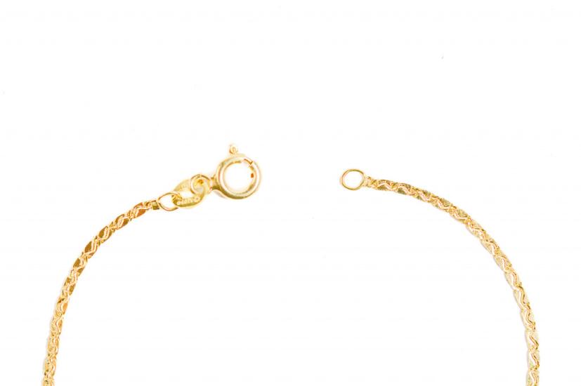 Zlatý náramek o ryzosti 585/1000, punc labuť. Váha 1,34 g, délka 17 cm, šířka 1,5 mm.
