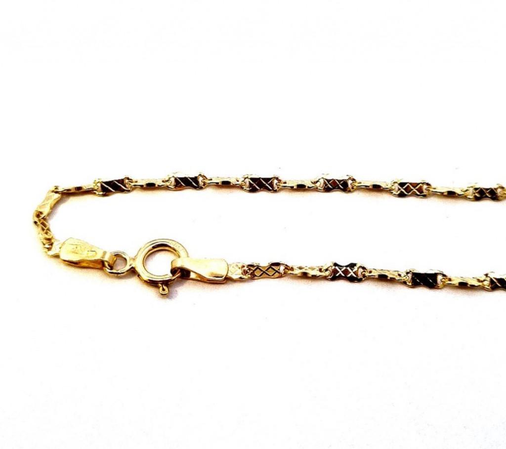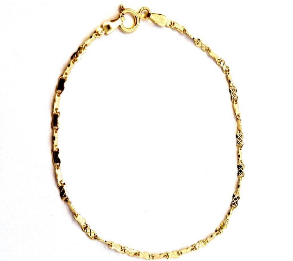 Zlatý náramek o ryzosti 585/1000, punc labuť. Váha 1,66 g, délka 17 cm, šířka 2 mm.