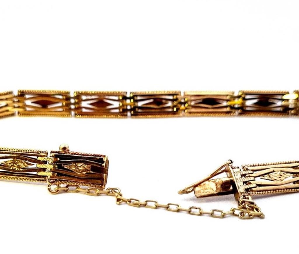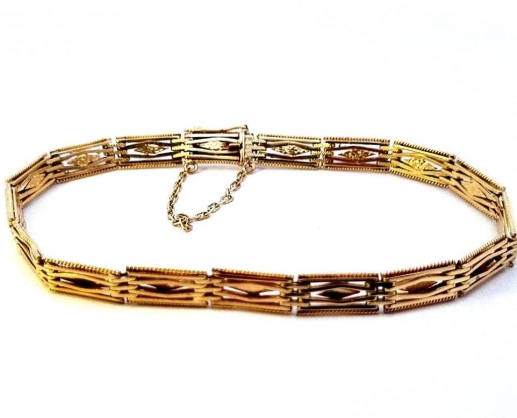Zlatý náramek o ryzosti 585/1000, punc labuť. Váha 10,22 g, vnitřní průměr 67 mm, šířka 6 mm.
