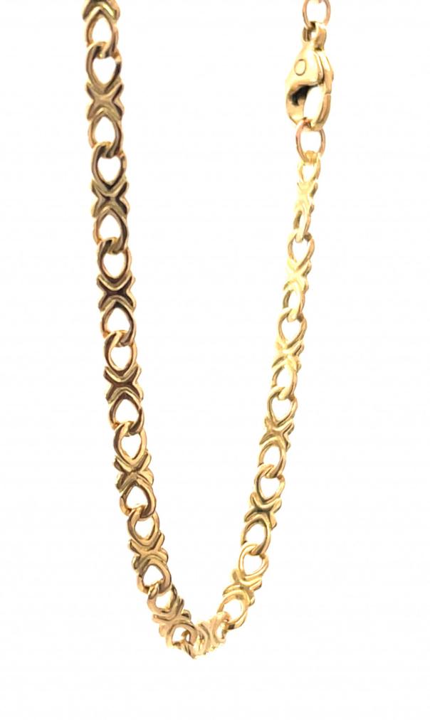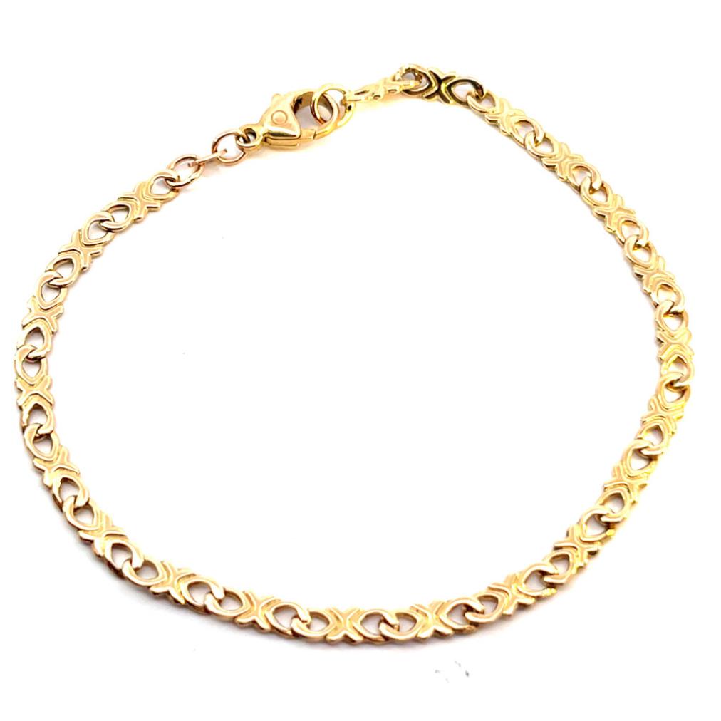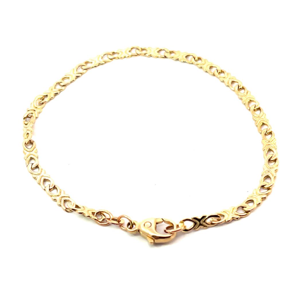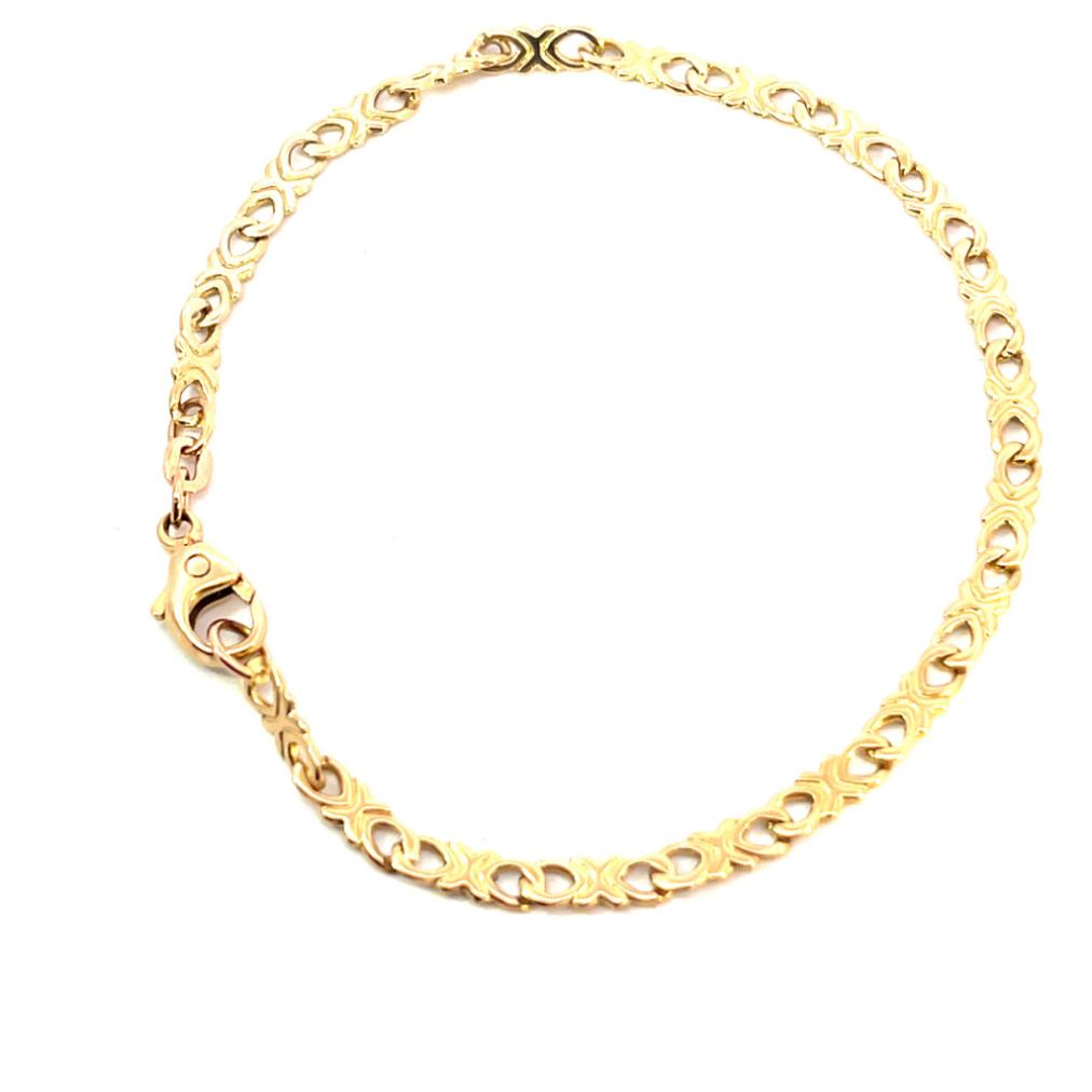 Zlatý náramek o ryzosti 585/1000, punc labuť. Váha 4,85 g, délka 19 cm, v nejširším bodě 3,5 mm.